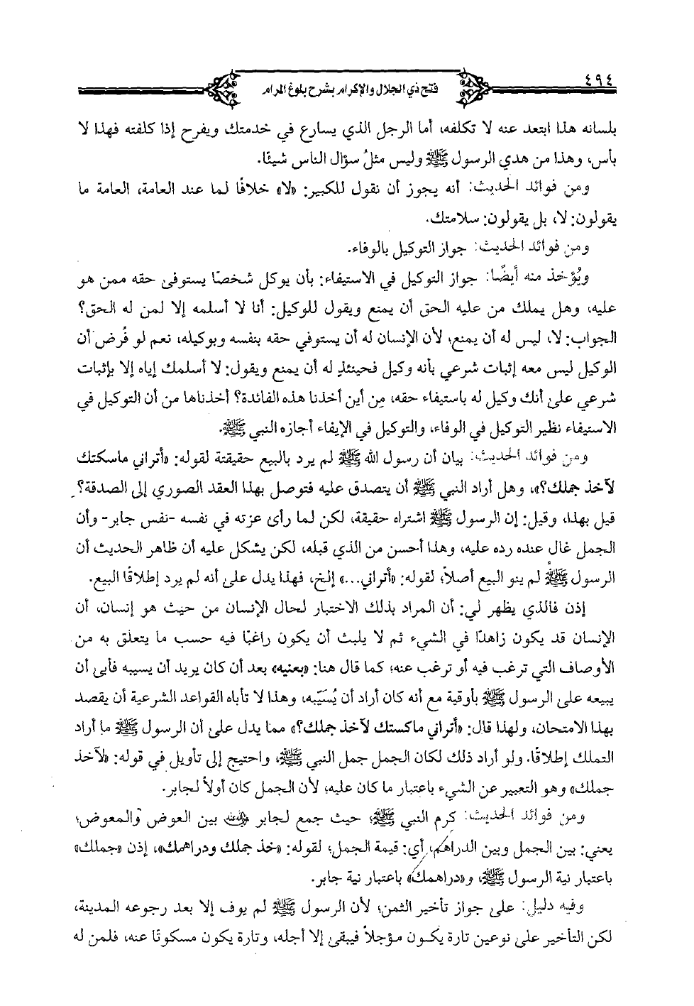 ومن فوائد الحديث: بيان أن رسول الله صلى الله عليه وسلم لم يرد بالبيع حقيقتة لقوله: "أتراني ماسكتك لآخذ جملك؟ "، وهل أراد النبي صلى الله عليه وسلم أن يتصدق عليه فتوصل بهذا العقد الصوري إلى الصدقة؟ قيل بهذا، وقيل: إن الرسول صلى الله عليه وسلم اشتراه حقيقة، لكن لما رأى عزته في نفسه -نفس جابر- وأن الجمل غالٍ عنده رده عليه، وهذا أحسن من الذي قبله، لكن يشكل عليه أن ظاهر الحديث أن الرسول صلى الله عليه وسلم لم ينو البيع أصلًا؛ لقوله: "أتراني ... " إلخ، فهذا يدل على أنه لم يرد إطلاقًا البيع.