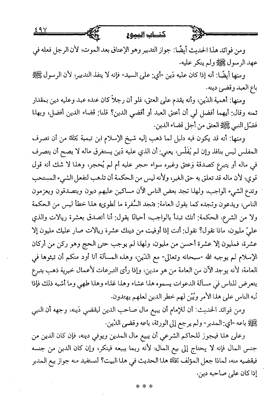 ومنها: أهمية الدَّين، وأنه يقدم على العتق، فلو أن رجلًا كان عنده عبد وعليه دين بمقدار ثمنه وقال: أيهما أفضل لي أن أعتق العبد أو أقضي الدين؟ قلنا: قضاء الدين أفضل، وبهذا فضّل النبي صلى الله عليه وسلم العتق من أجل قضاء الدين.