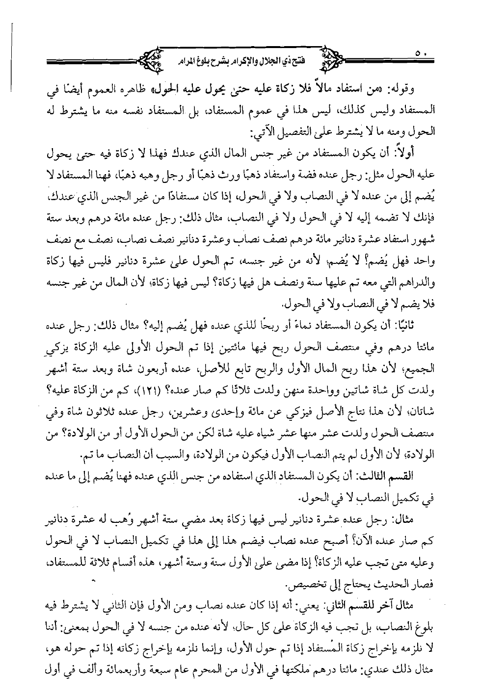 مثال: رجل عنده عشرة دنانير ليس فيها زكاة بعد مضي ستة أشهر وهب له عشرة دنانير كم صار عنده الآن؟ أصبح عنده نصاب فيضم هذا إلى هذا في تكميل النصاب لا في الحول وعليه متى تجب عليه الزكاة؟ إذا مضى على الأول سنة وستة أشهر، هذه أقسام ثلاثة للمستفاد، فصار الحديث يحتاج إلى تخصيص.