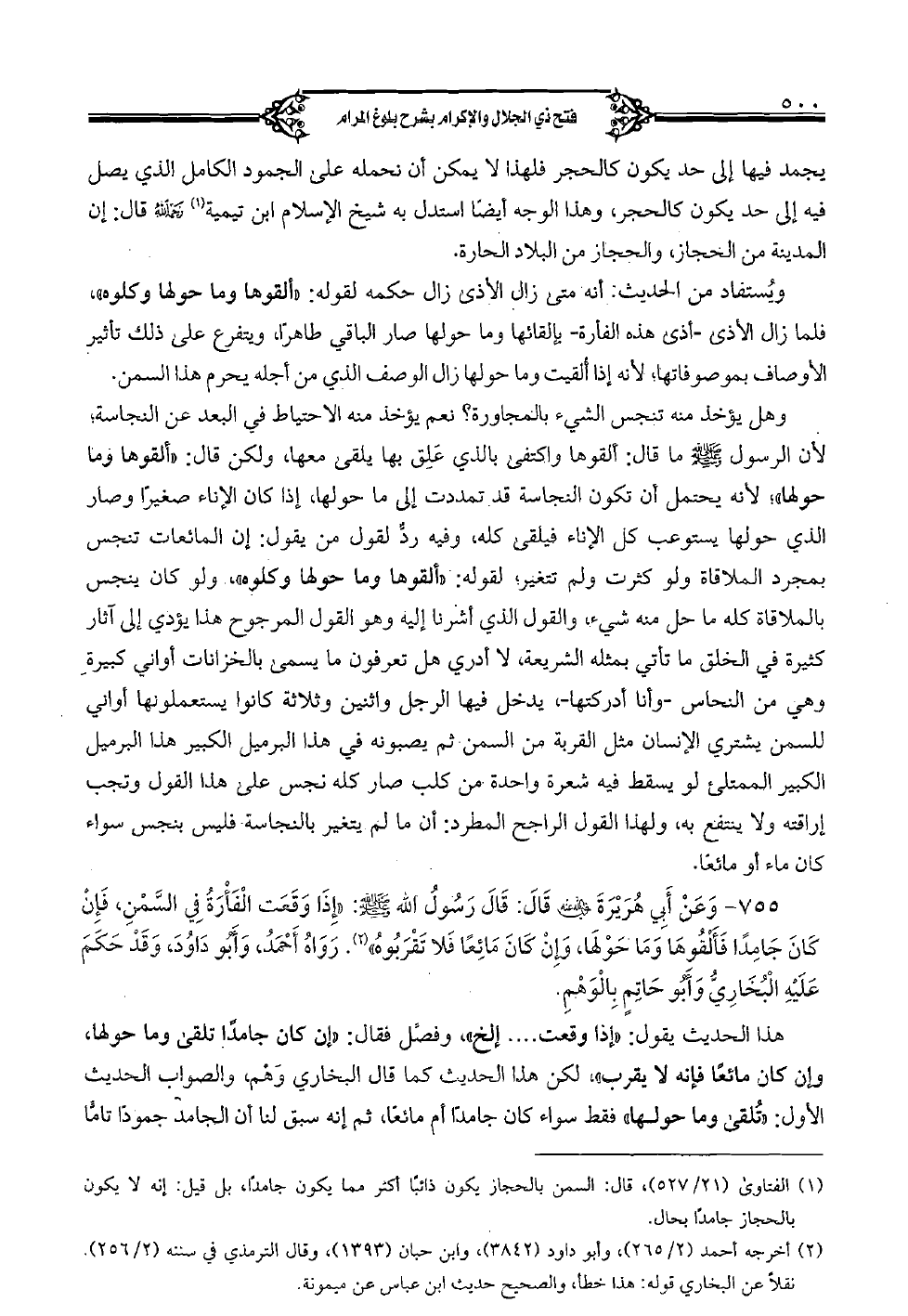755 - وعن أبي هريرة رضي الله عنه قال: قال رسول الله صلى الله عليه وسلم: "إذا وقعت الفأرة في السَّمن، فإن كان جامدًا فألقوها وما حولها، وإن كان مائعًا فلا تقربوه". رواه أحمد، وأبو داود، وقد حكم عليه البخاريُّ وأبو حاتمٍ بالوهم.