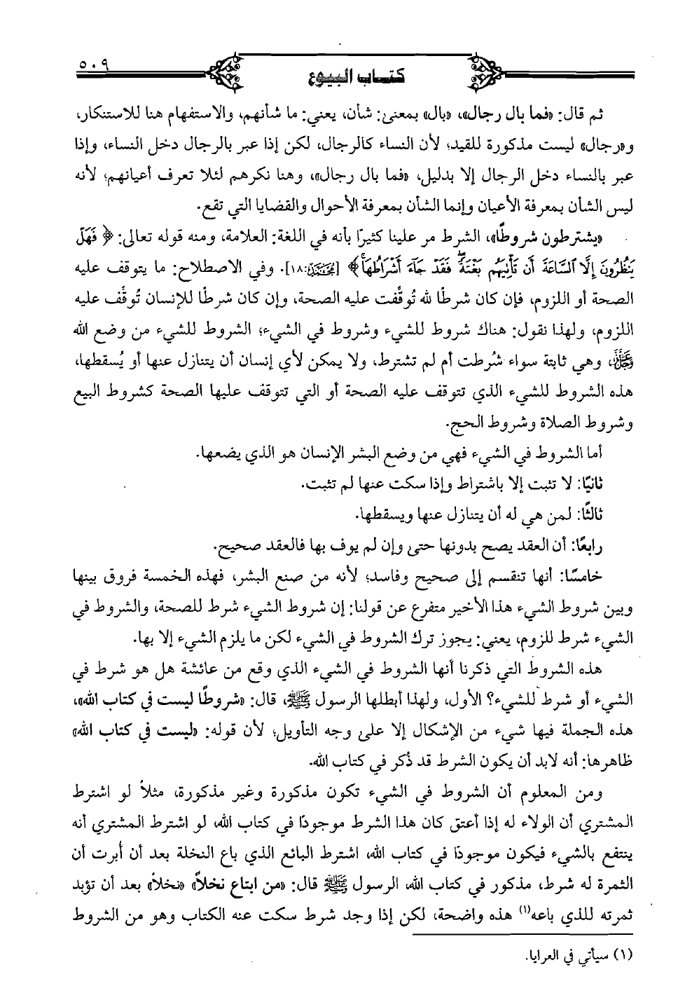 "يشترطون شروطًا"، الشرط مر علينا كثيرًا بأنه في اللغة: العلامة، ومنه قوله تعالى: {فهل ينظرون إلَّا السَّاعة أن تأتيهم بغتةً فقد جاء أشراطها} [محمد: 18]. وفي الاصطلاح: ما يتوقف عليه الصحة أو اللزوم، فإن كان شرطًا لله توقِّفت عليه الصحة، وإن كان شرطًا للإنسان توقِّف عليه اللزوم، ولهذا نقول: هناك شروط للشيء وشروط في الشيء؛ الشروط للشيء من وضع الله عزَّ وجل، وهي ثابتة سواء شرطت أم لم تشترط، ولا يمكن لأي إنسان أن يتنازل عنها أو يسقطها، هذه الشروط للشيء الذي تتوقف عليه الصحة أو التي تتوقف عليها الصحة كشروط البيع وشروط الصلاة وشروط الحج.