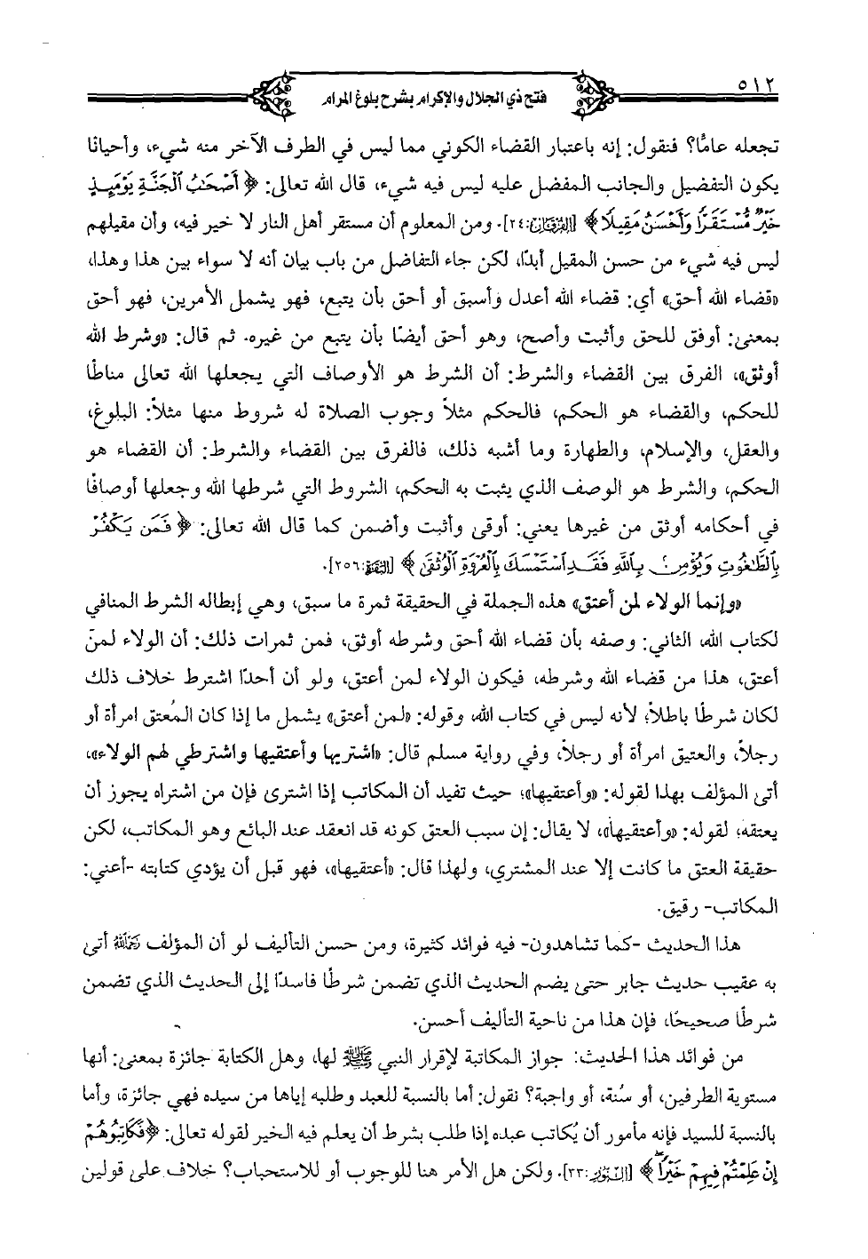 "وإنما الولاء لمن أعتق" هذه الجملة في الحقيقة ثمرة ما سبق، وهي إبطاله الشرط المنافي لكتاب الله، الثاني: وصفه بأن قضاء الله أحق وشرطه أوثق، فمن ثمرات ذلك: أن الولاء لمن أعتق، هذا من قضاء الله وشرطه، فيكون الولاء لمن أعتق، ولو أن أحدًا اشترط خلاف ذلك لكان شرطًا باطلًا؛ لأنه ليس في كتاب الله، وقوله: "لمن أعتق" يشمل ما إذا كان المعتق امرأة أو رجلًا، والعتيق امرأة أو رجلًا، وفي رواية مسلم قال: "اشتريها وأعتقيها واشترطي لهم الولاء"، أتى المؤلف بهذا لقوله: "وأعتقيها"؛ حيث تفيد أن المكاتب إذا اشترى فإن من اشتراه يجوز أن يعتقه؛ لقوله: "وأعتقيها"، لا يقال: إن سبب العتق كونه قد انعقد عند البائع وهو المكاتب، لكن حقيقة العتق ما كانت إلا عند المشتري، ولهذا قال: "أعتقيها"، فهو قبل أن يؤدي كتابته -أعني: المكاتب- رقيق.