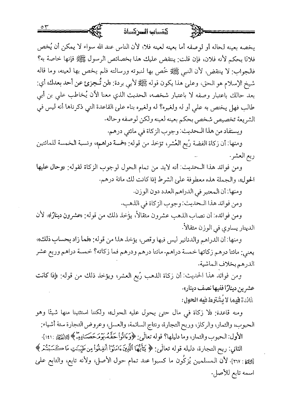 ومنها: أن الدراهم والدنانير ليس فيها وقص، يؤخذ هذا من قوله: "فما زاد بحساب ذلك": يعني: مائتا درهم زكاتها خمسة دراهم. مائتا درهم ودرهم فما زكاته؟ خمسة درهم وربع عشر الدرهم بخلاف الماشية.