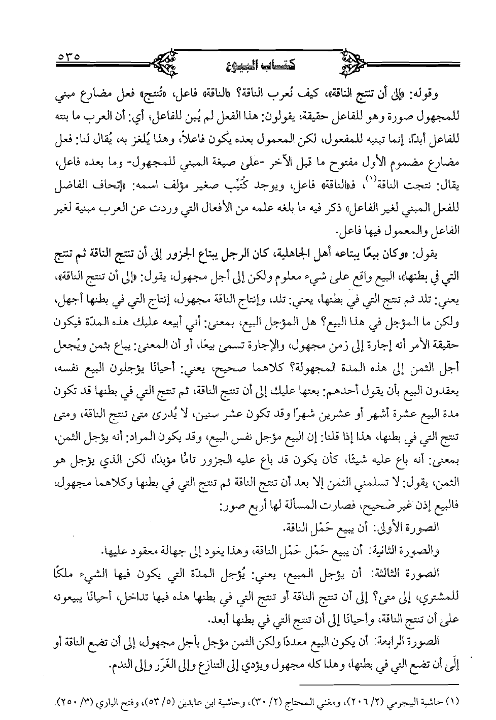 التي في بطنها"، البيع واقع على شيء معلوم ولكن إلى أجل مجهول، يقول: "إلى أن تنتج الناقة"، يعني: تلد ثم تنتج التي في بطنها، يعني: تلد، وإنتاج الناقة مجهول، إنتاج التي في بطنها أجهل، ولكن ما المؤجل في هذا البيع؟ هل المؤجر البيع، بمعنى: أني أبيعه عليك هذه المدّة فيكون حقيقة الأمر أنه إجارة إلى زمن مجهول، والإجارة تسمى بيعًا، أو أن المعنى: يباع بثمن ويجعل أجل الثمن إلى هذه المدة المجهولة؟ كلاهما صحيح، يعني: أحيانًا يؤجلون البيع نفسه، يعقدون البيع بأن يقول أحدهم: بعتها عليك إلى أن تنتج الناقة، ثم تنتج التي في بطنها قد تكون مدة البيع عشرة أشهر أو عشرين شهرًا وقد تكون عشر سنين، لا يدرى متى تنتج الناقة، ومتى تنتج التي في بطنها، هذا إذا قلنا: إن البيع مؤجل نفس البيع، وقد يكون المراد: أنه يؤجل الثمن، بمعنى: أنه باع عليه شيئًا، كأن يكون قد باع عليه الجزور تامًّا مؤبدًا، لكن الذي يؤجل هو الثمن، يقول: لا تسلمني الثمن إلا بعد أن تنتج الناقة ثم تنتج التي في بطنها وكلاهما مجهول، فالبيع إذن غير صحيح، فصارت المسألة لها أربع صور: