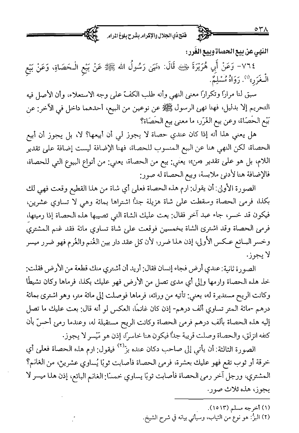 هل يعني هذا أنه إذا كان عندي حصاة لا يجوز لي أن أبيعها؟ لا، بل يجوز أن أبيع الحصاة، لكن النهي هنا عن البيع المنسوب للحصاة، فهنا الإضافة ليست إضافة على تقدير اللام، بل هو على تقدير "من"؛ يعني: بيع من الحصاة، يعني: من أنواع البيوع التي للحصاة، فالإضافة هنا لأدنى ملابسة، وبيع الحصاة له صور:
