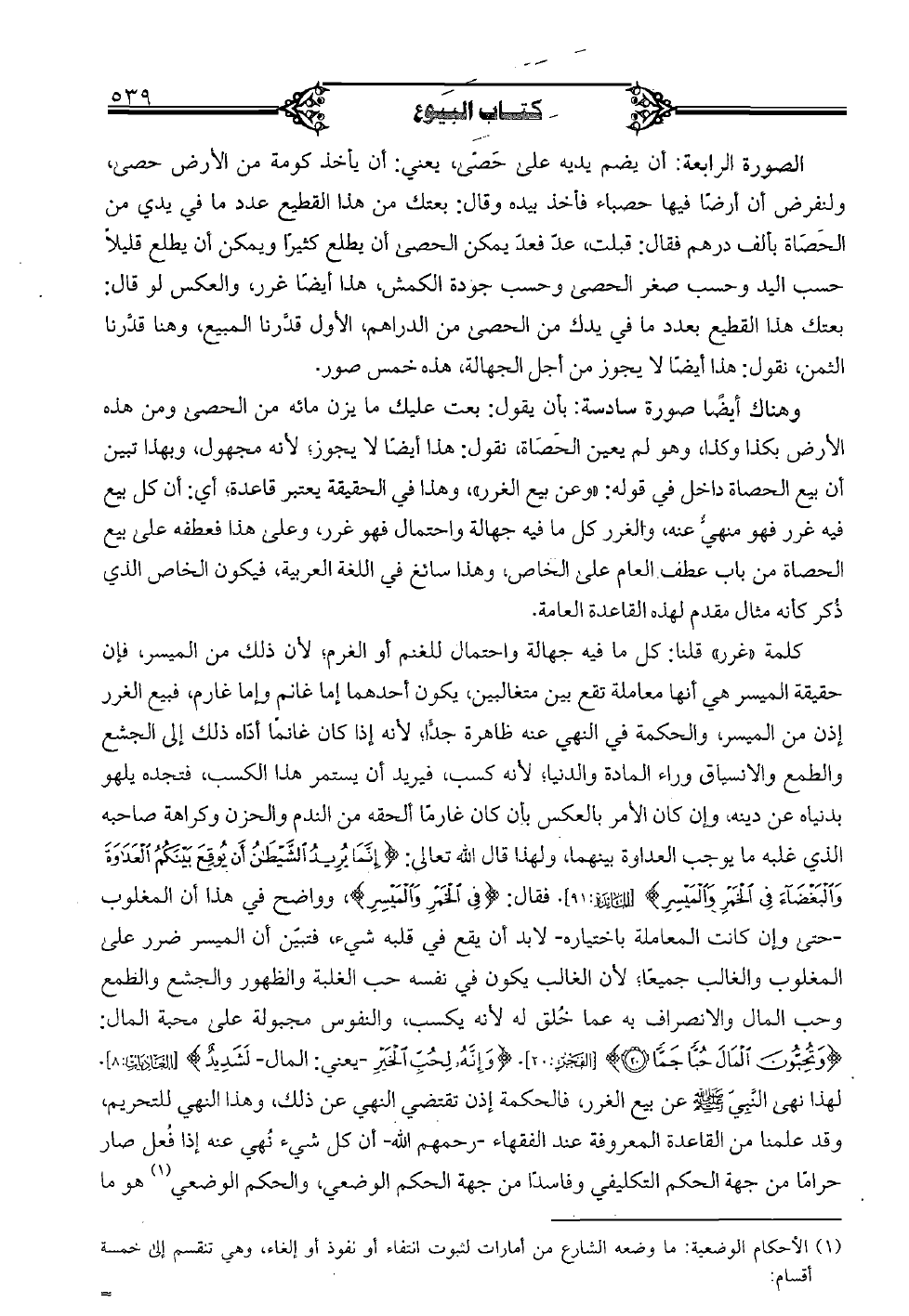 كلمة "غرر" قلنا: كل ما فيه جهالة واحتمال للغنم أو الغرم؛ لأن ذلك من الميسر، فإن حقيقة الميسر هي أنها معاملة تقع بين متغالبين، يكون أحدهما إما غانم وإما غارم، فبيع الغرر إذن من الميسر، والحكمة في النهي عنه ظاهرة جدًّا؛ لأنه إذا كان غانمًا أدّاه ذلك إلى الجشع والطمع والانسياق وراء المادة والدنيا؛ لأنه كسب، فيريد أن يستمر هذا الكسب، فتجده يلهو بدنياه عن دينه، وإن كان الأمر بالعكس بأن كان غارمًا ألحقه من الندم والحزن وكراهة صاحبه الذي غلبه ما يوجب العداوة بينهما، ولهذا قال الله تعالى: {إنَّما يريد الشَّيطان أن يوقع بينكم العداوة والبغضاء فى الخمر والميسر} [المائدة: 91]. فقال: {فى الخمر والميسر}، وواضح في هذا أن المغلوب -حتى وإن كانت المعاملة باختياره- لا بد أن يقع في قلبه شيء، فتبيّن أن الميسر ضرر على المغلوب والغالب جميعًا؛ لأن الغالب يكون في نفسه حب الغلبة والظهور والجشع والطمع وحب المال والانصراف به عما خلق له لأنه يكسب، والنفوس مجبولة على محبة المال: {وتحبُّون المال حبًّا جمًّا (20)} [الفجر: 20]. {وإنَّه لحبِّ الخير -يعني: المال- لشديدٌ} [العاديات: 8]. لهذا نهى النَّبيّ صلى الله عليه وسلم عن بيع الغرر، فالحكمة إذن تقتضي النهي عن ذلك، وهذا النهي للتحريم، وقد علمنا من القاعدة المعروفة عند الفقهاء -رحمهم الله- أن كل شيء نهي عنه إذا فعل صار حرامًا من جهة الحكم التكليفي وفاسدًا من جهة الحكم الوضعي، والحكم الوضعي هو ما