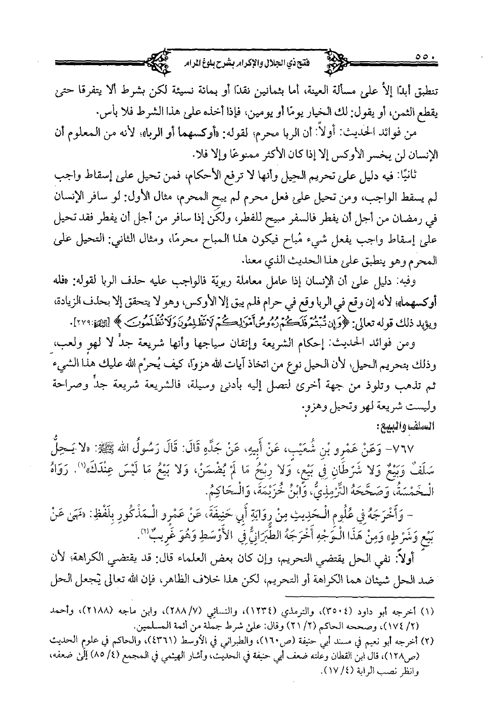 767 - وعن عمرو بن شعيبٍ، عن أبيه، عن جدِّه قال: قال رسول الله صلى الله عليه وسلم: "لا يحلُّ سلفٌ وبيعٌ ولا شرطان في بيعٍ، ولا ربح ما لم يضمن، ولا بيع ما ليس عندك". رواه الخمسة وصحَّحه التِّرمذيُّ، وابن خزيمة والحاكم.