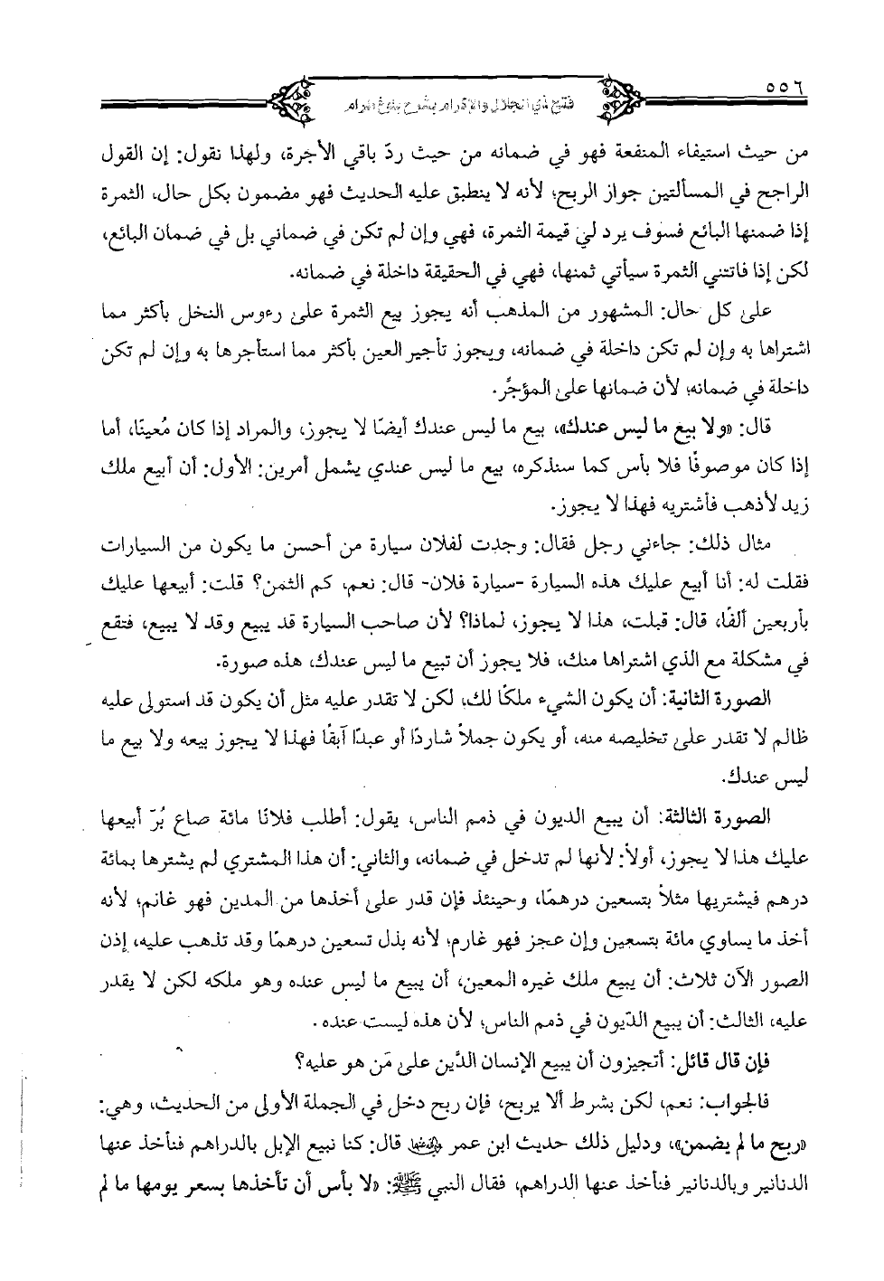 الصورة الثالثة: أن يبيع الديون في ذمم الناس، يقول: أطلب فلانًا مائة صاغ بُرّ أبيعها عليك هذا لا يجوز، أولًا: لأنها لم تدخل في ضمانه، والثاني: أن هذا المشتري لم يشترها بمائة درهم فيشتريها مثلًا بتسعين درهمًا، وحينئذ فإن قدر على أخذها من المدين فهو غانم، لأنه أخذ ما يساوي مائة بتسعين وإن عجز فهو غارم، لأنه بذل تسعين درهمًا وقد تذهب عليه، إذن الصور الآن ثلاث: أن يبيع ملك غيره المعين، أن يبيع ما ليس عنده وهو ملكه لكن لا يقدر عليه، الثالث: أن يبيع الديون في ذمم الناس، لأن هذه ليست عنده.