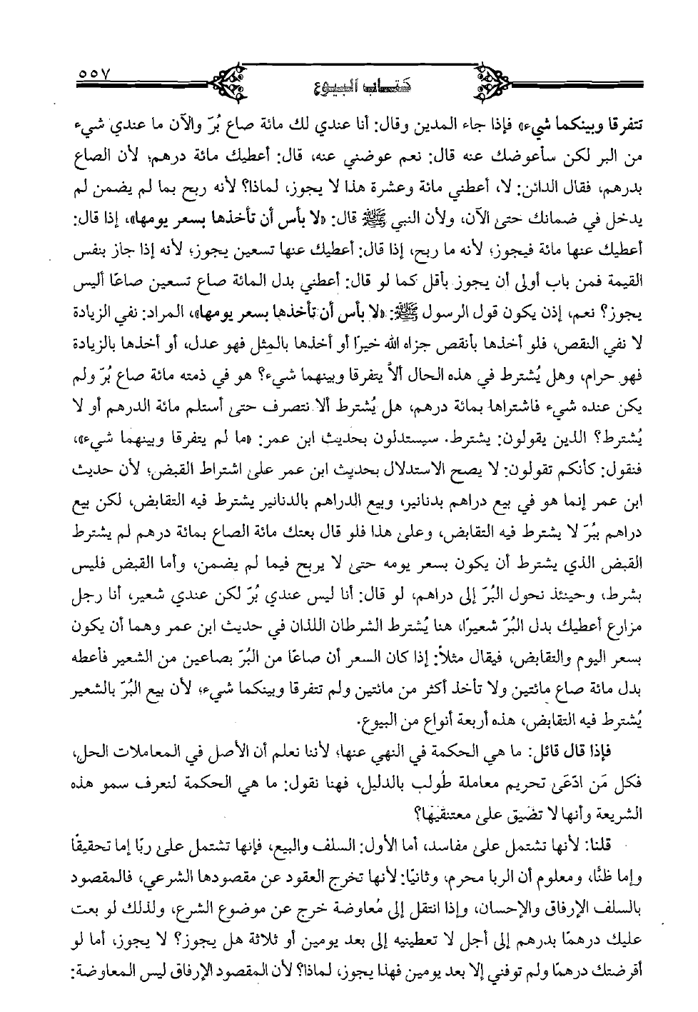 تتفرقا وبينكما شيء" فإذا جاء المدين وقال: أنا عندي لك مائة صاغ بُرّ والآن ما عندي شيء من البر لكن سأعوضك عنه قال: نعم عوضني عنه، قال: أعطيك مائة درهم، لأن الصاع بدرهم، فقال الدائن: لا، أعطني مائة وعشرة هذا لا يجوز، لماذا؟ لأنه ربح بما لم يضمن لم يدخل في ضمانك حتى الآن، ولأن النبي صلى الله عليه وسلم قال: "لا بأس أن تأخذها بسعر يومها" إذا قال: أعطيك عنها مائة فيجوز؛ لأنه ما ربح، إذا قال: أعطيك عنها تسعين يجوز؛ لأنه إذا جاز بنفس القيمة فمن باب أولى أن يجوز بأقل كما لو قال: أعطني بدل المائة صاع تسعين صاعًا أليس يجوز؟ نعم، إذن يكون قول الرسول صلى الله عليه وسلم: " لا بأس أن تأخذها بسعر يومها"، المراد: نفي الزيادة لا نفي النقص، فلو أخذها بأنقص جزاء الله خيرًا أو أخذها بالمثل فهو عدل، أو أخذها بالزيادة فهو حرام، وهل يُشترط في هذه الحال ألا يتفرقا وبينهما شيء؟ هو في ذمته مائة صاع بُرّ ولم يكن عنده شيء فاشتراها بمائة درهم، هل يُشترط ألا نتصرف حتى أستلم مائة الدرهم أو لا يُشترط؟ الذين يقولون: يشترط. سيستدلون بحديث ابن عمر: "ما لم يتفرقا وبينهما شيء"، فنقول: كأنكم تقولون: لا يصح الاستدلال بحديث ابن عمر على اشتراط القبض، لأن حديث ابن عمر إنما هو في بيع دراهم بدنانير، وبيع الدراهم بالدنانير يشترط فيه التقابض، لكن بيع دراهم ببُرّ لا يشترط فيه التقابض، وعلى هذا فلو قال بعتك مائة الصاع بمائة درهم لم يشترط القبض الذي يشترط أن يكون بسعر يومه حتى لا يربح فيما لم يضمن، وأما القبض فليس بشرط، وحينئذ نحول البُرّ إلى دراهم، لو قال: أنا ليس عندي بُرّ لكن عندي شعير، أنا رجل مزارع أعطيك بدل البُرّ شعيرًا، هنا يُشترط الشرطان اللذان في حديث ابن عمر وهما أن يكون بسعر اليوم والتقابض، فيقال مثلًا: إذا كان السعر أن صاعًا من البُرّ بصاعين من الشعير فأعطه بدل مائة صاع مائتين ولا تأخذ أكثر من مائتين ولم تتفرقا وبينكما شيء، لا يبيع البًرّ بالشعير يُشترط فيه التقابض، هذه أربعة أنواع من البيوع.