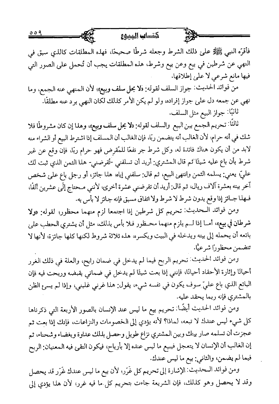 ثالثًا: تحريم الجمع بين البيع والسلف لقوله: "لا يحل سلف وبيع"، وهذا إن كان مشروطًا فلا شك في أنه حرام، لأن الغالب أنه يتضمن ربًا، فإن الغالب أن المسلف إذا اشترط البيع أو الشراء منه لابد أن يكون هناك فائدة له، وكل شرط جر نفعًا للمقرض فهو حرام ربًا، فإن وقع عن غير شرط بأن باع عليه شيئًا ثم قال المشتري: أريد أن تسلفني-تُقرضني-هذا الثمن الذي ثبت لك علي يعني: يسلمه الثمن وانتهى البيع، ثم قال: سلفني إياه، هذا جائز، أو رجل باع على شخص آخر بيته بعشرة آلاف ريال، ثم قال: أريد أن تقرضني عشرة أخرى، لأنني محتاج إلى عشرين ألفًا، فهذا جائز إذا وقع بدون شرط لا شرط ولا اتفاق مسبق فإنه جائز لا بأس به.