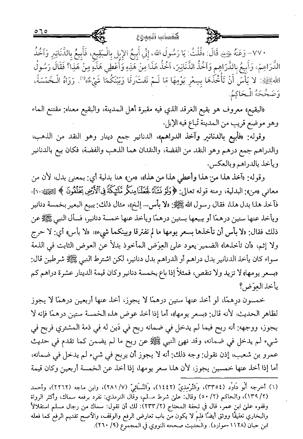 وقوله: "آخذ هذا من هذا وأعطي هذا من هذا"، "من" هنا بدلية أي: بمعنى بدل؛ لأن من معاني "من" البدلية، ومنه قوله تعالى: {ولو نشاء لجعلنا منكم ملائكة في الأرض يخلفون} [الزخرف: 60]. فآخذ هذا يدل هذا، فقال رسول الله صلى الله عليه وسلم: "لا بأس .... إلخ) مثال ذلك: يبيع البعير بخمسة دنانير ويأخذ عنها ستين درهمًا أو يبيعها بستين درهمًا ويأخذ عنها خمسة دنانير، فسأل النبي صلى الله عليه وسلم عن ذلك فقال: "لا بأس أن تأخذها بسعر يومها ما لم تفترقا وبينكما شيء" "لا بأس" أي: لا حرج ولا إثم: "أن تأخذها" الضمير يعود على العوض المأخوذ بدلًا من العوض الثابت في الذمة سواء كان يأخذ الدنانير بدل دراهم أو الدراهم بدل دنانير، لكن اشترط النبي صلى الله عليه وسلم شرطين قال: "بسعر يومها" لا تزيد ولا تنقص، فمثلًا إذا باع بخمسة دنانير وكان قيمة الدينار عشرة دراهم كم يأخذ العِوض؟