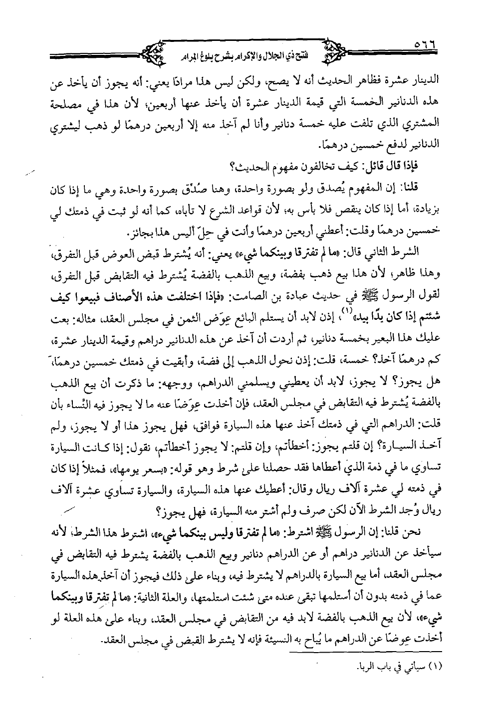 الشرط الثاني قال: "وما لم تفترقا وبينكما شيء" يعني: أنه يُشترط قبض العوض قبل التفرق، وهذا ظاهر، لأن هذا بيع ذهب بفضة، وبيع الذهب بالفضة يُشترط فيه التقابض قبل التفرق، لقول الرسول صلى الله عليه وسلم في حديث عبادة بن الصامت: "فإذا اختلفت هذه الأصناف فبيعوا كيف شيء تم إذا كان يدًا بيد"، إذن لابد أن يستلم البائع عِوض الثمن في مجلس العقد، مثاله: بعت عليك هذا البعير بخمسة دنانير، ثم أردت أن أخذ عن هذه الدنانير دراهم وقيمة الدينار عشرة كم درهمًا آخذ؟ خمسة، قلت: إذن نحول الذهب إلى فضة، وأبقيت في ذمتك خمسين درهمًا، هل يجوز؟ لا يجوز، لابد أن يعطيني ويسلمني الدراهم، ووجهه: ما ذكرت أن بيع الذهب بالفضة يُشترط فيه التقابض في مجلس العقد، فإن أخذت عٍوضًا عنه ما لا يجوز فيه النساء بأن قلت: الدراهم التي في ذمتك آخذ عنها هذه السيارة فوافق، فهل يجوز هذا أو لا يجوز، ولم آخذ السيارة؟ إن قلتم يجوز: أخطأتم، وإن قلتم: لا يجوز أخطأتم، نقول: إذا كانت السيارة تساوي ما في ذمة الذي أعطاها فقد حصلنا على شرط وهو قوله: "بسعر يومها"، فمثلًا إذا كان في ذمته لي عشرة آلاف ريال وقال: أعطيك عنها هذه السيارة، والسيارة تساوي عشرة آلاف ريال وُجد الشرط الآن لكن صرف ولم أشتر منه السيارة، فهل يجوز؟