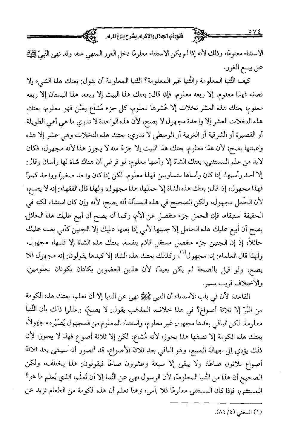 القاعدة الآن في باب الاستثناء أن النبي صلى الله عليه وسلم نهى عن الثنيا إلا أن تعلم، بعتك هذه الكومة من البر إلا ثلاثة أصواع؟ في خلاف المذهب يقول: لا يصح، وعللوا ذلك بأن الثنيا معلومة، لكن الباقي بعدها مجهول غير معلوم، واستثناء المعلوم من المجهول يصيره مجهولاً، بعتك هذه الكومة إلا نصفها هذا يجوز؛ لأنه مشاع، لكن إلا ثلاثة أصواع فهذا لا يجوز؛ لأن ذلك يؤدي إلى جهالة المبيع، وهو الباقي بعد ثلاثة الأصواع، قد أتصور أنه سيبقى بعد ثلاثة أصواع ثلاثون صاعًا، ولا يبقى إلا سبعة وعشرون صاعًا فيقولون: هذا يختلف، ولكن الصحيح أن هذا من الثنيا المعلومة؛ لأن الرسول نهى عن الثنيا إلا أن تعلم، الذي يعلم ما هو؟ المستثنى، فإذا كان المستثنى معلومًا فلا بأس، وهنا نعلم أن هذه الكومة من الطعام تزيد عن