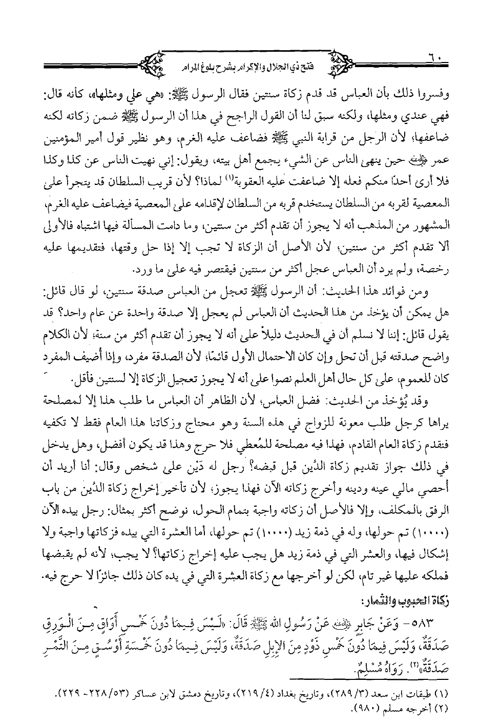وفسروا ذلك بأن العباس قد قدم زكاة سنتين فقال الرسول صلى الله عليه وسلم: وهي علي ومثلها"، كأنه قال: فهي عندي ومثلها، ولكنه سبق لنا أن القول الراجح في هذا أن الرسول صلى الله عليه وسلم ضمن زكاته لكنه ضاعفها؛ لأن الرجل من قرابة النبي صلى الله عليه وسلم فضاعف عليه الغرام، وهو نظير قول أمير المؤمنين عمر رضي الله عنه حين ينهى الناس عن الشيء يجمع أهل بيته، ويقول: إني نهيت الناس عن كذا وكذا فلا أرى أحدًا منكم فعله إلا ضاعفت عليه العقوبة لماذا؟ لأن قريب السلطان قد يتجرأ على المعصية لقربه من السلطان يستخدم قربه من السلطان لإقدامه على المعصية فيضاعف عليه الغرام، المشهور من المذهب أنه لا يجوز أن تقدم أكثر من سنتين، وما دامت المسألة فيها اشتباه فالأولى ألا تقدم أكثر من سنتين؛ لأن الأصل أن الزكاة لا تجب إلا إذا حل وقتها، فتقديمها عليه رخصة، ولم يرد أن العباس عجل أكثر من سنتين فيقتصر فيه على ما ورد.