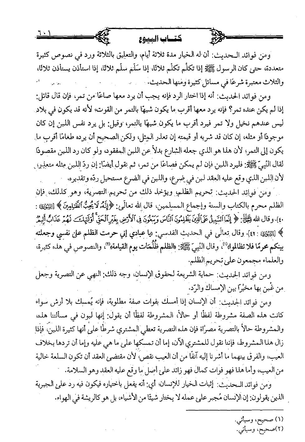 ومن فوائد الحديث: تحريم الظلم، ويؤخذ ذلك من تحريم التصرية، وهو كذلك، فإن الظلم محرم بالكتاب والسنة وإجماع المسلمين، قال الله تعالى: } إنه لا يحب الظالمين {[الشورى: 40]. وقال الله عز وجل: } إنما السبيل على الذين يظلمون الناس ويبغون في الأرض بغير الحق أولئك لهم عذاب أليم {[الشورى: 42]. وقال تعالى في الحديث القدسي: "يا عبادي إني حرمت الظلم على نفسي وجعلته بينكم محرمًا فلا تظالموا"، وقال الَّنبيّ صلى الله عليه وسلم: "الظلم ظلمات يوم القيامة"، والنصوص في هذه كثيرة، والعلماء مجمعون على تحريم الظلم.