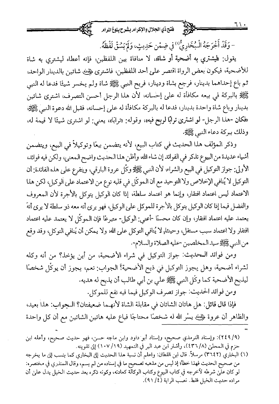 وذكر المؤلف هذا الحديث في كتاب البيع؛ لأنه يتضمن بيعًا وتوكيلًا في البيع، ويتضمن أشياء عديدة من البيوع تذكر في الفوائد إن شاء الله، وأظن هذا الحديث واضح المعنى، ولكن فيه فوائد، الأولى: جواز التوكيل في البيع والشراء؛ لأن النبي صلى الله عليه وسلم وكَّل عروة البارقي، ويتفرع على هذه الفائدة: أن التوكيل لا ينافي الإخلاص ولا التوحيد مع أن الموكل في قلبه نوع من الاعتماد على الوكيل، لكن هذا الاعتماد ليس اعتماد افتقار، وإنما هو اعتماد سلطة، إذا كان الوكيل يتوكل بالأجرة لأن المعروف والفضل فيما إذا كان الوكيل يتوكل بالأجرة للموكل على الوكيل، فهو يرى أنه معه ذو سلطة لا يرى أنه يعتمد عليه اعتماد افتقار، وإن كان محسنًا -أعني: الوكيل- متبرعًا فإن الموكِّل لا يعتمد عليه اعتماد افتقار ولا اعتماد سبب مستقل، وحينئذ لا ينافي التوكل على الله، ولا يمكن أن ينافي التوكل، وقد وقع من النبي صلى الله عليه وسلم سيد المخلصين -عليه الصلاة والسلام-.