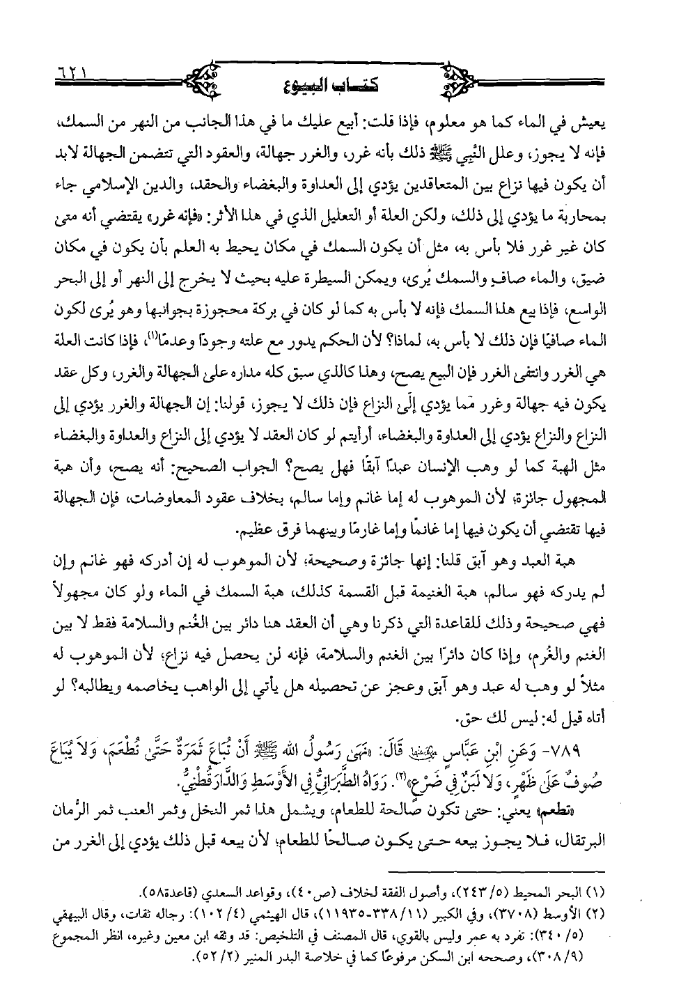 يعيش في الماء كما هو معلوم، فإذا قلت: أبيع عليك ما في هذا الجانب من النهر من السمك، فإنه لا يجوز، وعلل النبي صلى الله عليه وسلم ذلك بأنه غرر، والغرر جهالة، والعقود التي تتضمن الجهالة لابد أن يكون فيها نزاع بين المتعاقدين يؤدي إلى العداوة والبغضاء والحقد، والدين الإسلامي جاء بمحاربة ما يؤدي إلى ذلك، ولكن العلة أو التعليل الذي في هذا الأثر: "فإنه غرر" يقتضي أنه متى كان غير غرر فلا بأس به، مثل أن يكون السمك في مكان يحيط به العلم بأن يكون في مكان ضيق، والماء صاف والسمك يرى، ويمكن السيطرة عليه بحيث لا يخرج إلى النهر أو إلى البحر الواسع، فإذا بيع هذا السمك فإنه لا بأس به كما لو كان في بركة محجوزة بجوانبها وهو يرى لكون الماء صافيًا فإن ذلك لا بأس به، لماذا؟ لأن الحكم يدور مع علته وجودًا وعدمًا، فإذا كانت العلة هي الغرر وانتفي الغرر فإن البيع يصح، وهذا كالذي سبق كله مداره على الجهالة والغرر، وكل عقد يكون فيه جهالة وغرر مما يؤدي إلى النزاع فإن ذلك لا يجوز، قولنا: إن الجهالة والغرر يؤدي إلى النزاع والنزاع يؤدي إلى العداوة والبغضاء، أرأيتم لو كان العقد لا يؤدي إلى النزاع والعداوة والبغضاء مثل الهبة كما لو وهب الإنسان عبدًا آبقًا فهل يصح؟ الجواب الصحيح: أنه يصح، وأن هبة المجهول جائزة؛ لأن الموهوب له إما غانم وإما سالم، بخلاف عقود المعاوضات، فإن الجهالة فيها تقتضي أن يكون فيها إما غانمًا وإما غارمًا وبينهما فرق عظيم.