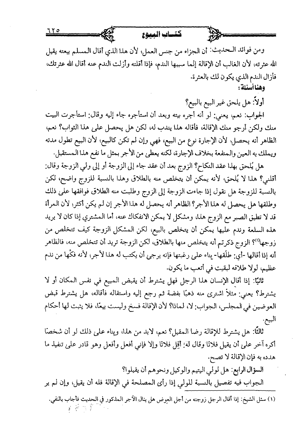 هل يلحق بهذا عقد النكاح؟ الزوج بعد أن عقد جاء إلى الزوجة أو إلى ولي الزوجة وقال: أقلني؟ هذا لا يلحق؛ لأنه يمكن أن يتخلص منه بالطلاق وهذا بالنسبة للزوج واضح، لكن بالنسبة للزوجة هل نقول إذا جاءت الزوجة إلى الزوج وطلبت منه الطلاق فوافقها على ذلك وطلقها هل يحصل له هذا الأجر؟ الظاهر أنه يحصل له هذا الأجر إن لم يكن أكثر؛ لأن المرأة قد لا تطيق الصبر مع الزوج هذا، ومشكل لا يمكن الانفكاك عنه، أما المشتري إذا كان لا يريد هذه السلعة وندم عليها يمكن أن يتخلص بالبيع، لكن المشكل الزوجة كيف تتخلص من زوجها؟ الزوج ذكرتم أنه يتخلص منها بالطلاق، لكن الزوجة تريد أن تتخلص منه، فالظاهر أنه إذا أقالها- أي: طلقها- بناء على رغبتها فإنه يرجى أن يكتب له هذا الأجر؛ لأنه فكها من ندم عظيم، لولا طلاقه لبقيت في أتعب ما يكون.