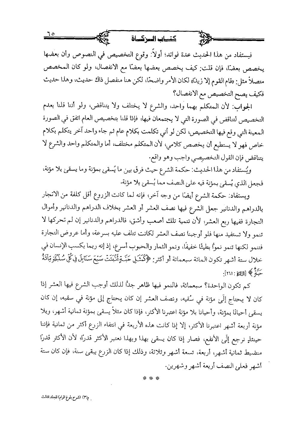 ويستفاد: حكمة الشرع أيضًا من وجه آخر، فإنه لما كانت الزروع أقل كلفة من الاتجار بالدراهم والدنانير جعل الشرع فيها نصف العشر أو العشر بخلاف الدراهم والدنانير وأموال التجارة ففيها ربع العشر؛ لأن تنمية تلك أصعب وأشق، فالدراهم والدنانير إن لم تحركها لا تنمو ولا تستفيد منها فلو أوجبنا نصف العشر لكانت تتلف عليه بسرعة، وأما عروض التجارة فتنمو لكنها تنمو نموًا بطيئا خفيفا، ونمو الثمار والحبوب أسرع، إذ إنه ربما يكسب الإنسان في خلال ستة أشهر تكون المائة سبعمائة أو أكثر: {كمثل حبة أنبتت سبع سنابل في كل سنبلة مئة حبة} [البقرة: 261].