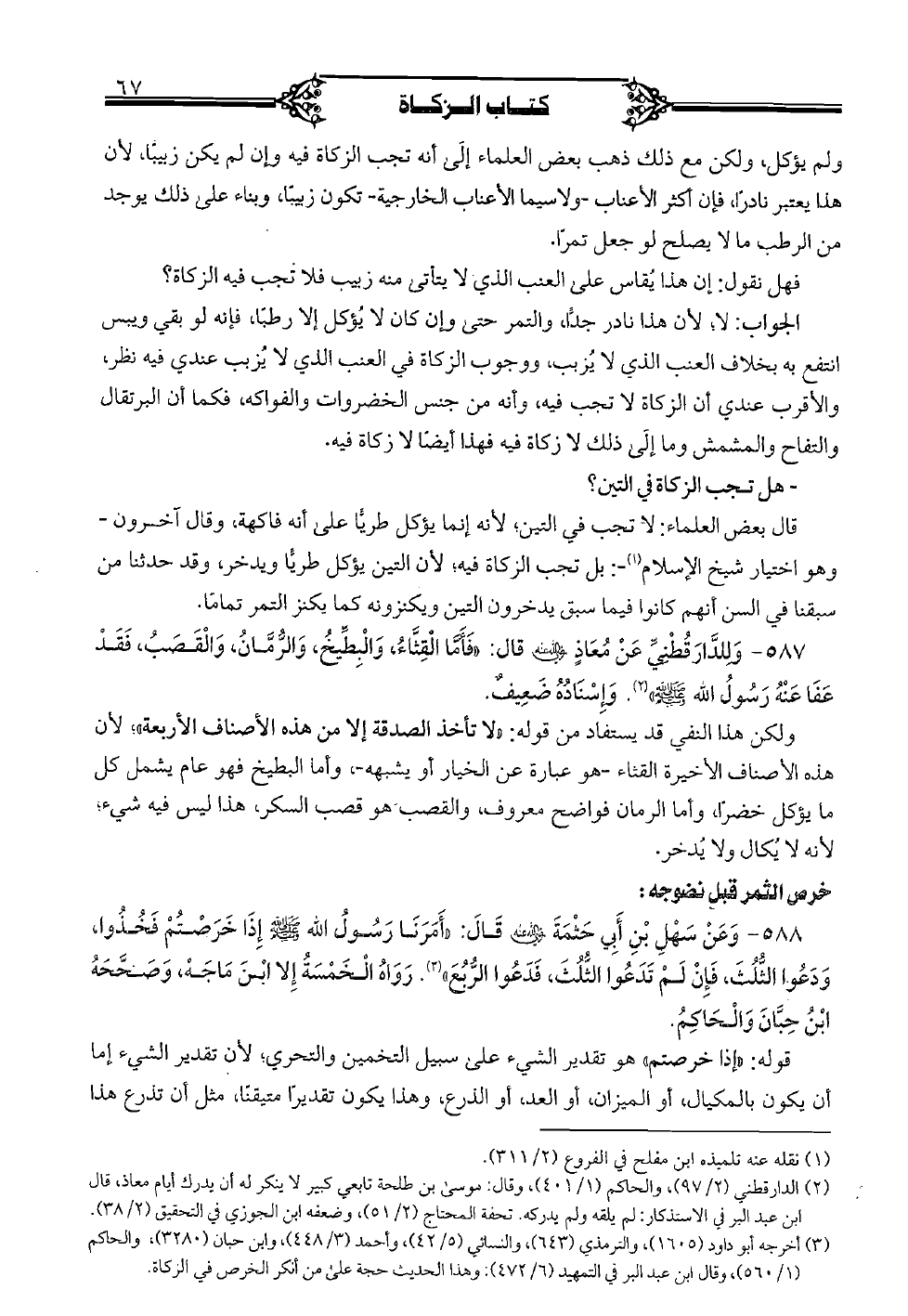 588 - وعن سهل بن أبي حثمة رضي الله عنه قال: "أمرنا رسول الله صلى الله عليه وسلم إذا خرصتم فخذوا، ودعوا الثلث، فإن لم تدّعوا الثلث، فدعوا الربع". رواه الخمسًة إلا ابن ماجه، وصححه ابن جبان والحاكم.