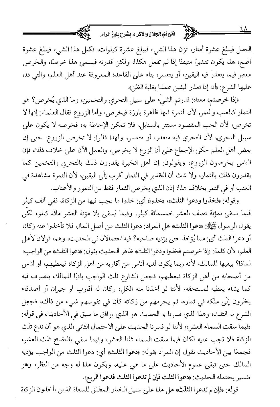 وقوله: "فخذوا ودعوا الثلث"، "خذوا" أي: خذوا ما يجب فيها من الزكاة، ففي ألف كيلو فيما يسقى بمؤنة نصف العشر خمسمائة كيلو، وفيما يسقى بلا مؤنة العشر مائة كيلو، لكن يقول الرسول صلى الله عليه وسلم: "دعوا الثلث" هل المراد: دعوا الثلث من أصل المال فلا تأخذوا عنه زكاة، أو دعوا الثلث أي: مما يؤخذ حتى يؤديه صاحبه؟ فيه احتمالان في الحديث، وهما قولان لأهل العلم؛ لأن كلمة: "إذا خرصتم فخذوا ودعوا الثلث" ظاهر الحديث يقول: "دعوا الثلث" من الواجب، لماذا؟ يبقيها للمالك، لأنه ربما يكون لديه أناس من أقاربه من أهل الزكاة فيعطيهم، أو أناس من أصحابه من أهل الزكاة فيعطيهم، فجعل الشارع ثلث الواجب باقيا للمالك يتصرف فيه كما يشاء يعطيه لمستحقه؛ لأننا لو أخذنا منه الكل، وكان له أقارب أو جيران أو أصدقاء ينظرون إلى ملكه في ثماره، ثم يحرمهم من زكاته كان في نفوسهم شيء من ذلك، فجعل الشرع له الثلث، وهذا الذي فسرنا به الحديث هو الذي يوافق ما سبق في الأحاديث في قوله: "فيما سقت السماء العشر"، لأننا لو فسرنا الحديث على الاحتمال الثاني الذي هو أن ندع ثلث الزكاة فلا تجب عليه لكان فيما سقت السماء ثلثا العشر، وفيما سقي بالنضح ثلث العشر، فجمعًا بين الأحاديث نقول إن المراد بقوله: "دعوا الثلث" أي: دعوا الثلث من الواجب يؤديه المالك حتى تبقى عموم الأحاديث على ما هي عليه، ويكون هذا له وجه من النظر، وهو تفسير يحتمله الحديث: "دعوا الثلث فإن لم تدعوا الثلث فدعوا الربعة".