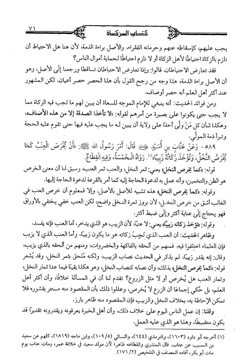 589 - وعن عتاب بن أسيد رضي الله عنه قال: أمر رسول الله صلى الله عليه وسلم "أن يخرص العنب كما يخرص النخل، وتؤخذ زكاته زبيبًا"". رواه الخمسة، وفيه انقطاع.