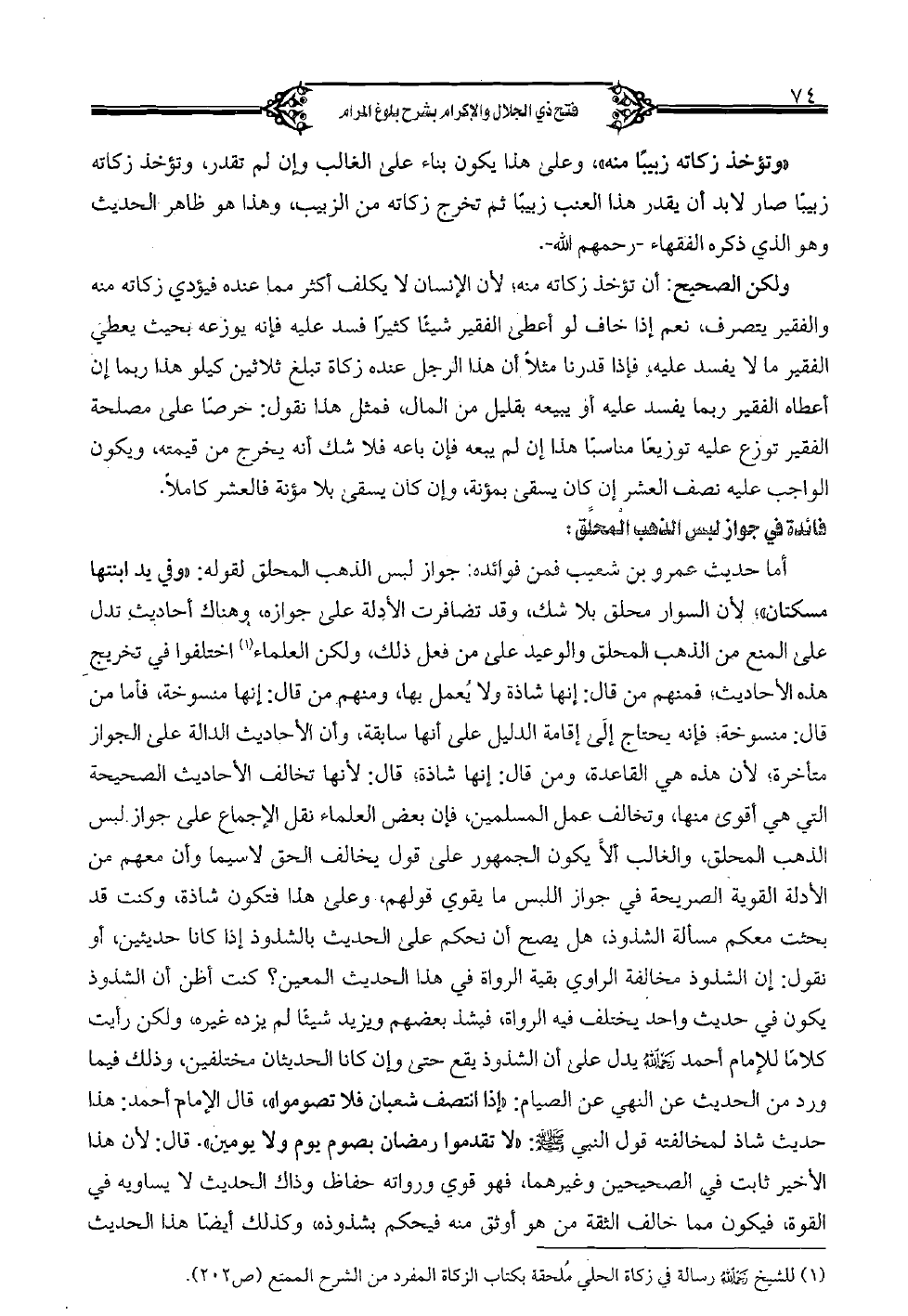 أما حديث عمرو بن شعيب فمن فوائده: جواز لبس الذهب المحلق لقوله: "وفي يد ابنتها مسكتان"؛ لأن السوار محلق بلا شك، وقد تضافرت الأدلة على جوازه، وهناك أحاديث تدل على المنع من الذهب المحلق والوعيد على من فعل ذلك، ولكن العلماء اختلفوا في تخريج هذه الأحاديث؛ فمنهم من قال: إنها شاذة ولا يعمل بها، ومنهم من قال: إنها منسوخة، فأما من قال: منسوخة، فإنه يحتاج إلى إقامة الدليل على أنها سابقة، وأن الأحاديث الدالة على الجواز متأخرة؛ لأن هذه هي القاعدة، ومن قال: إنها شاذة، قال: لأنها تخالف الأحاديث الصحيحة التي هي أقوى منها، وتخالف عمل المسلمين، فإن بعض العلماء نقل الإجماع على جواز لبس الذهب المحلق، والغالب ألا يكون الجمهور على قول يخالف الحق لا سيما وأن معهم من الأدلة القوية الصريحة في جواز اللبس ما يقوي قولهم، وعلى هذا فتكون شاذة، وكنت قد بحثت معكم مسألة الشذوذ، هل يصح أن نحكم على الحديث بالشذوذ إذا كانا حديثين، أو نقول: إن الشذوذ مخالفة الراوي بقية الرواة في هذا الحديث المعين؟ كنت أظن أن الشذوذ يكون في حديث واحد يختلف فيه الرواة، فيشذ بعضهم ويزيد شيئا لم يزده غيره، ولكن رأيت كلامًا للإمام أحمد رحمة الله يدل على أن الشذوذ يقع حتى وإن كانا الحديثان مختلفين، وذلك فيما ورد من الحديث عن النهي عن الصيام: "إذا أنتصف شعبان فلا تصوموا"، قال الإمام أحمد: هذا حديث شاذ لمخالفته قول النبي صلى الله عليه وسلم: "لا تقدموا رمضان بصوم يوم ولا يومين". قال: لأن هذا الأخير ثابت في الصحيحين وغيرهما، فهو قوي ورواته حفاظ وذاك الحديث لا يساويه في القوة، فيكون مما خالف الثقة من هو أوثق منه فيحكم بشذوذه، وكذلك أيضًا هذا الحديث