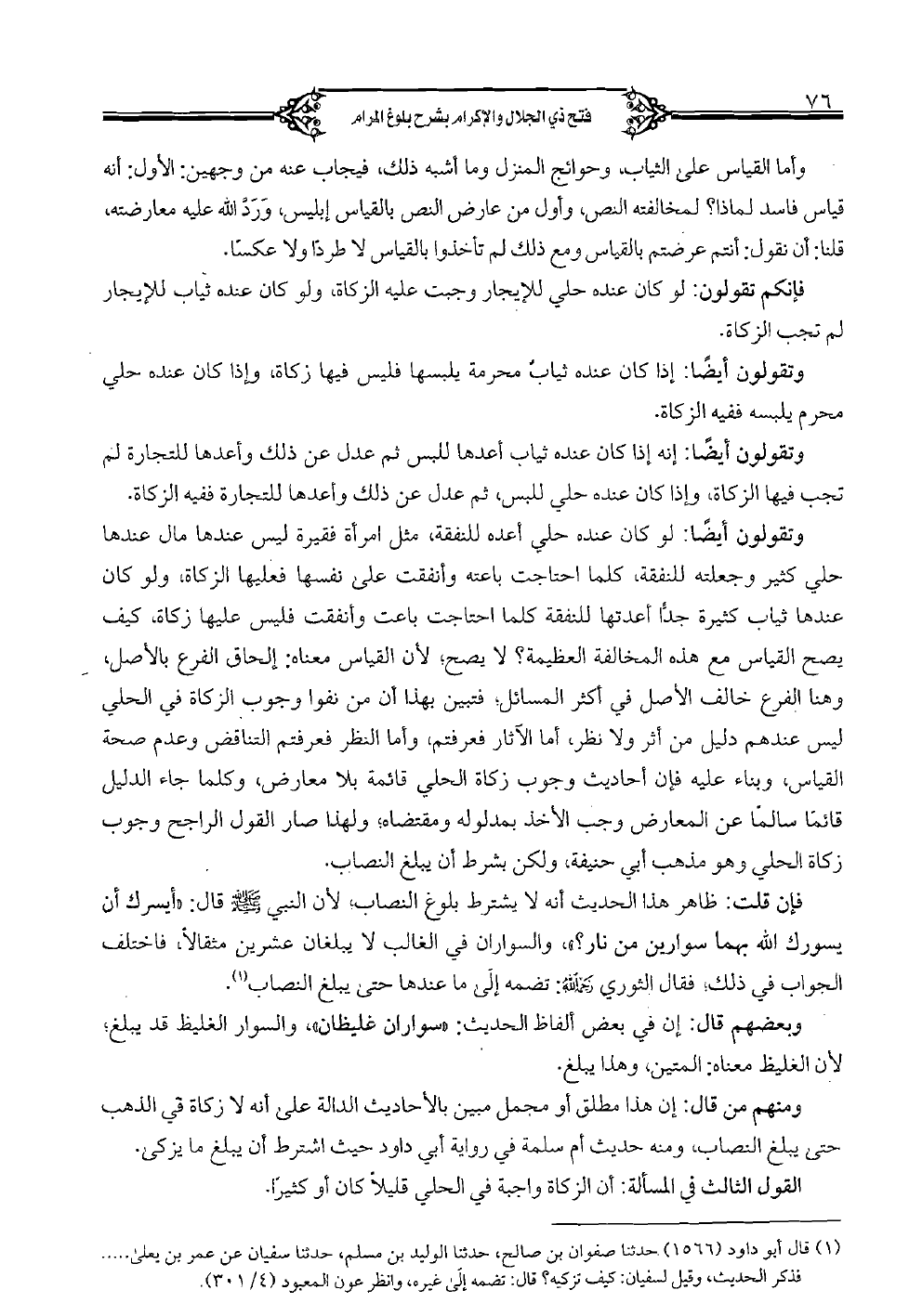 وتقولون أيضًا: لو كان عنده حلي أعده للنفقة، مثل امرأة فقيرة ليس عندها مال عندها حلي كثير وجعلته للنفقة، كلما احتاجت باعته وأنفقت على نفسها فعليها الزكاة، ولو كان عندها ثياب كثيرة جدا أعدتها للنفقة كلما احتاجت باعت وأنفقت فليس عليها زكاة، كيف يصح القياس مع هذه المخالفة العظيمة؟ لا يصبح لأن القياس معناه: إلحاق الفرع بالأصل، وهنا الفرع خالف الأصل في أكثر المسائل، فتبين بهذا أن من نفوا وجوب الزكاة في الحلي ليس عندهم دليل من أثر ولا نظر، أما الآثار فعرفتم، وأما النظر فعرفتم التناقض وعدم صحة القياس، وبناء عليه فإن أحاديث وجوب زكاة الحلي قائمة بلا معارض، وكلما جاء الدليل قائمًا سالما عن المعارض وجب الأخذ بمدلوله ومقتضاه، ولهذا صار القول الراجح وجوب زكاة الحلي وهو مذهب أبي حنيفة، ولكن بشرط أن يبلغ النصاب.