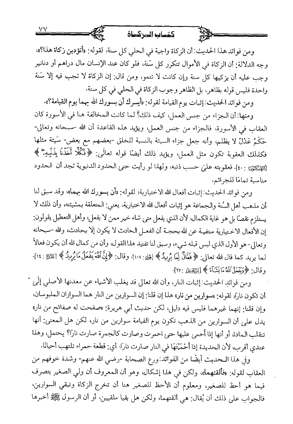 ومن فوائد هذا الحديث: أن الزكاة واجبة في الحلي كل سنة؛ لقوله: "أتؤدين زكاة هذا؟ "، وجه الدلالة: أن الزكاة في الأموال تتكرر كل سنة، فلو كان عند الإنسان مال دراهم أو دنانير وجب عليه أن يزكيها كل ستة وإن كانت لا تنمو، ومن قال: إن الزكاة لا تجب فيه إلا سنة واحدة فليس قوله بظاهر، بل الظاهر وجوب الزكاة في الحلي في كل سنة.