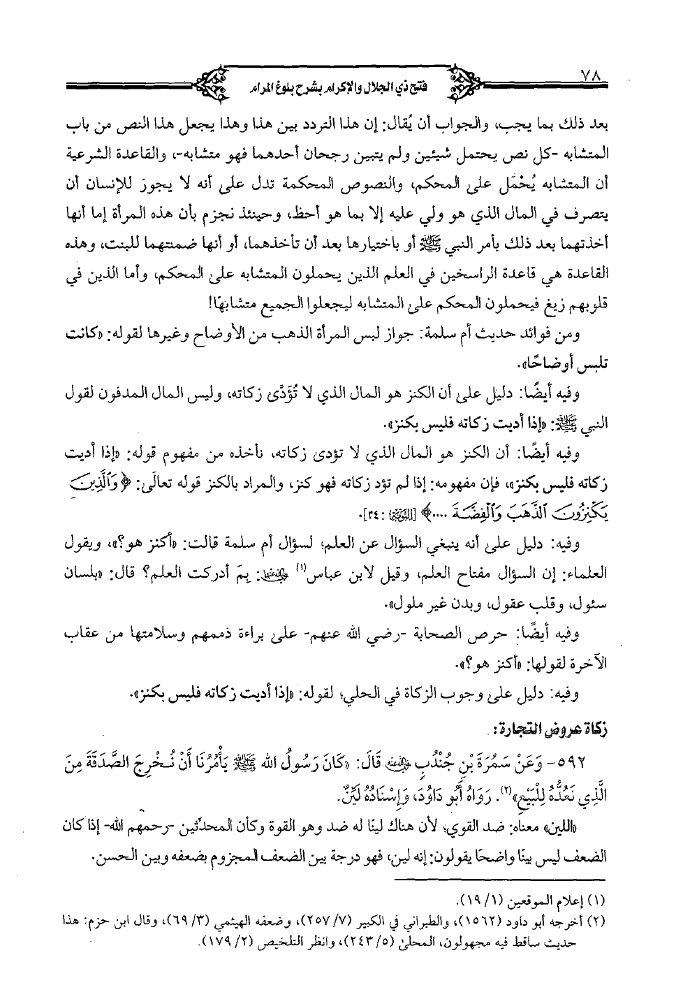 بعد ذلك بما يجب، والجواب أن يقال: إن هذا التردد بين هذا وهذا يجعل هذا النصر من باب المتشابه- كل نص يحتمل شيئين ولم يتبين رجحان أحدهما فهو متشابه-، والقاعدة الشرعية أن المتشابه يحمل على المحكم، والنصوص المحكمة تدل على أنه لا يجوز للإنسان أن يتصرف في المال الذي هو ولي عليه إلا بما هو أحظ، وحينئذ نجزم بأن هذه المرأة إما أنها أخذتهما بعد ذلك بأمر النبي صلى الله عليه وسلم أو باختيارها بعد أن تأخذهما، أو أنها ضمنتهما للبنت، وهذه القاعدة هي قاعدة الراسخين في العلم الذين يحملون المتشابه على المحكم، وأما الذين في قلوبهم زيغ فيحملون المحكم على المتشابه ليجعلوا الجميع متشابهًا!