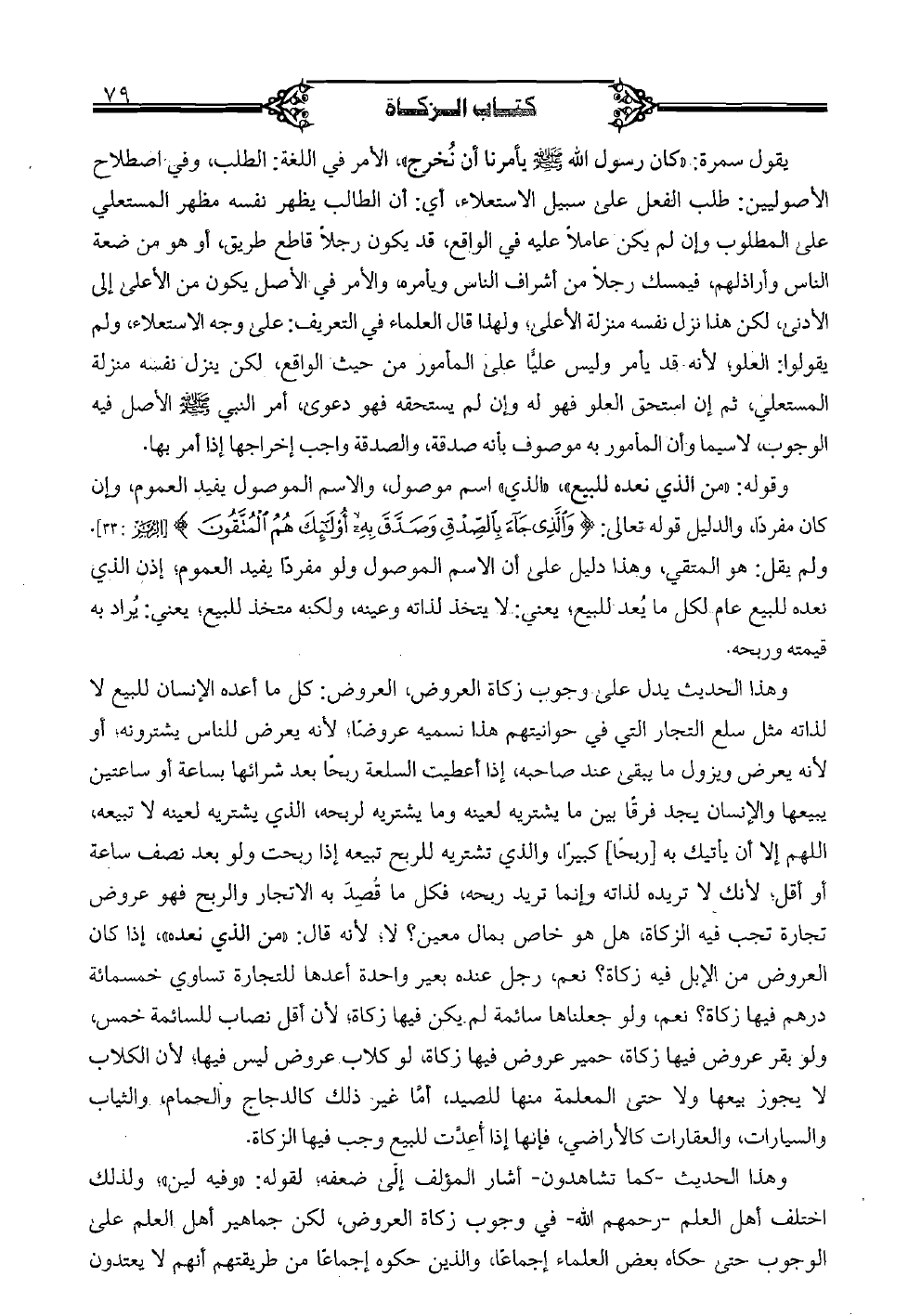 يقول سمرة: "كان رسول الله صلى الله عليه وسلم يأمرنا أن نخرج" الأمر في اللغة: الطلب، وفي اصطلاح الأصوليين: طلب الفعل على سبيل الاستعلاء، أي: أن الطالب يظهر نفسه مظهر المستعلي على المطلوب وإن لم يكن عاملًا عليه في الواقع، قد يكون رجلًا قاطع طريق، أو هو من ضعة الناس وأراذلهم، فيمسك رجلًا من أشراف الناس ويأمره، والأمر في الأصل يكون من الأعلى إلى الأدنى، لكن هذا نزل نفسه منزلة الأعلى؛ ولهذا قال العلماء في التعريف: على وجه الاستعلاء، ولم يقولوا: العلو، لأنه قد يأمر وليس عليا على المأمور من حيث الواقع، لكن ينزل نفسه منزلة المستعلي، ثم إن استحق العلو فهو له وإن لم يستحقه فهو دعوى، أمر النبي صلى الله عليه وسلم الأصل فيه الوجوب، لا سيما وأن المأمور به موصوف بأنه صدقة، والصدقة واجب إخراجها إذا أمر بها.