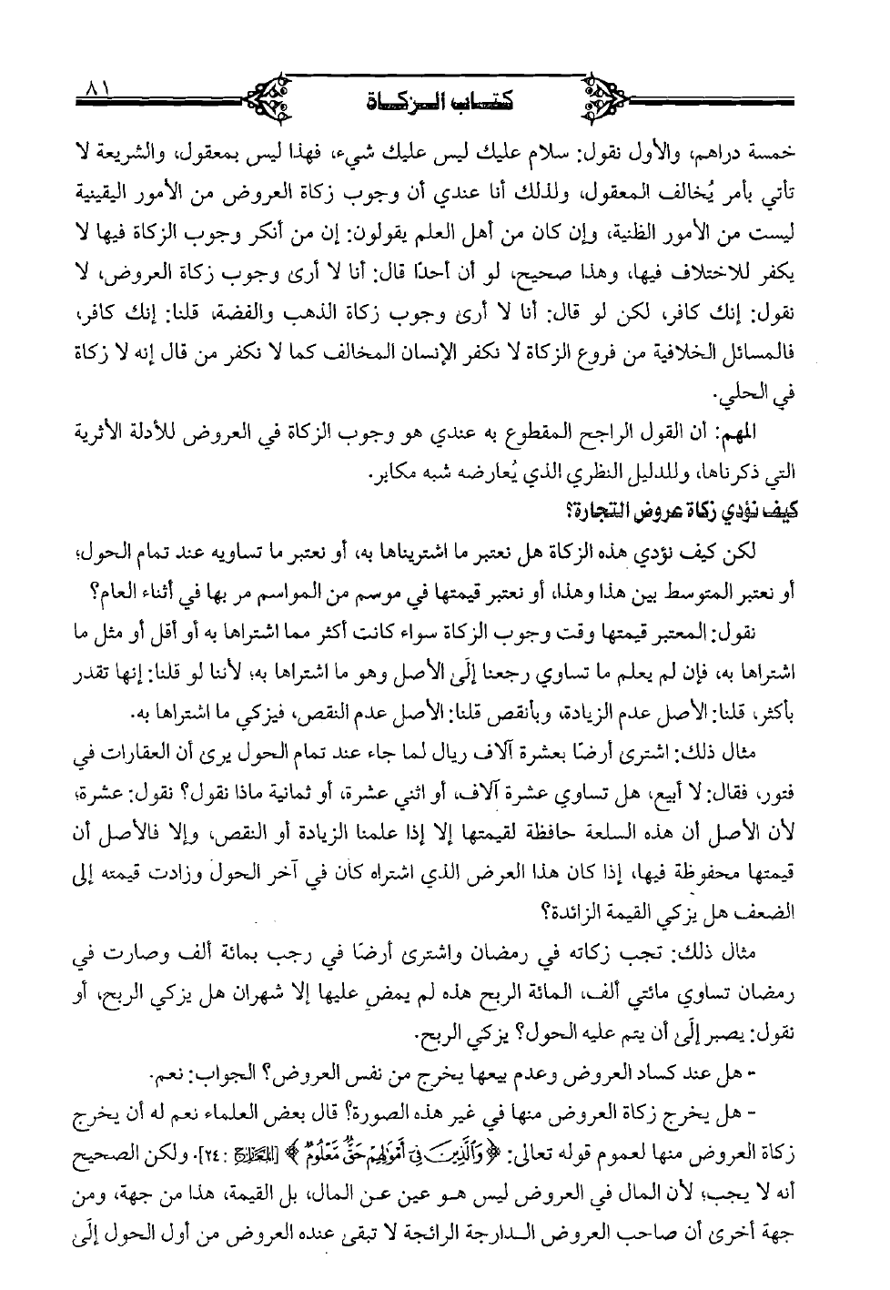 خمسة دراهم، والأول نقول: سلام عليك ليس عليك شيء، فهذا ليس بمعقول، والشريعة لا تأتي بأمر يخالف المعقول، ولذلك أنا عندي أن وجوب زكاة العروض من الأمور اليقينية ليست من الأمور الظنية، وإن كان من أهل العلم يقولون: إن من أنكر وجوب الزكاة فيها لا يكفر للاختلاف فيها، وهذا صحيح، لو أن أحدا قال: أنا لا أرى وجوب زكاة العروض، لا نقول: إنك كافر، لكن لو قال: أنا لا أرى وجوب زكاة الذهب والفضة، قلنا: إنك كافر، فالمسائل الخلافية من فروع الزكاة لا نكفر الإنسان المخالف كما لا تكفر من قال إنه لا زكاة في الحلي.