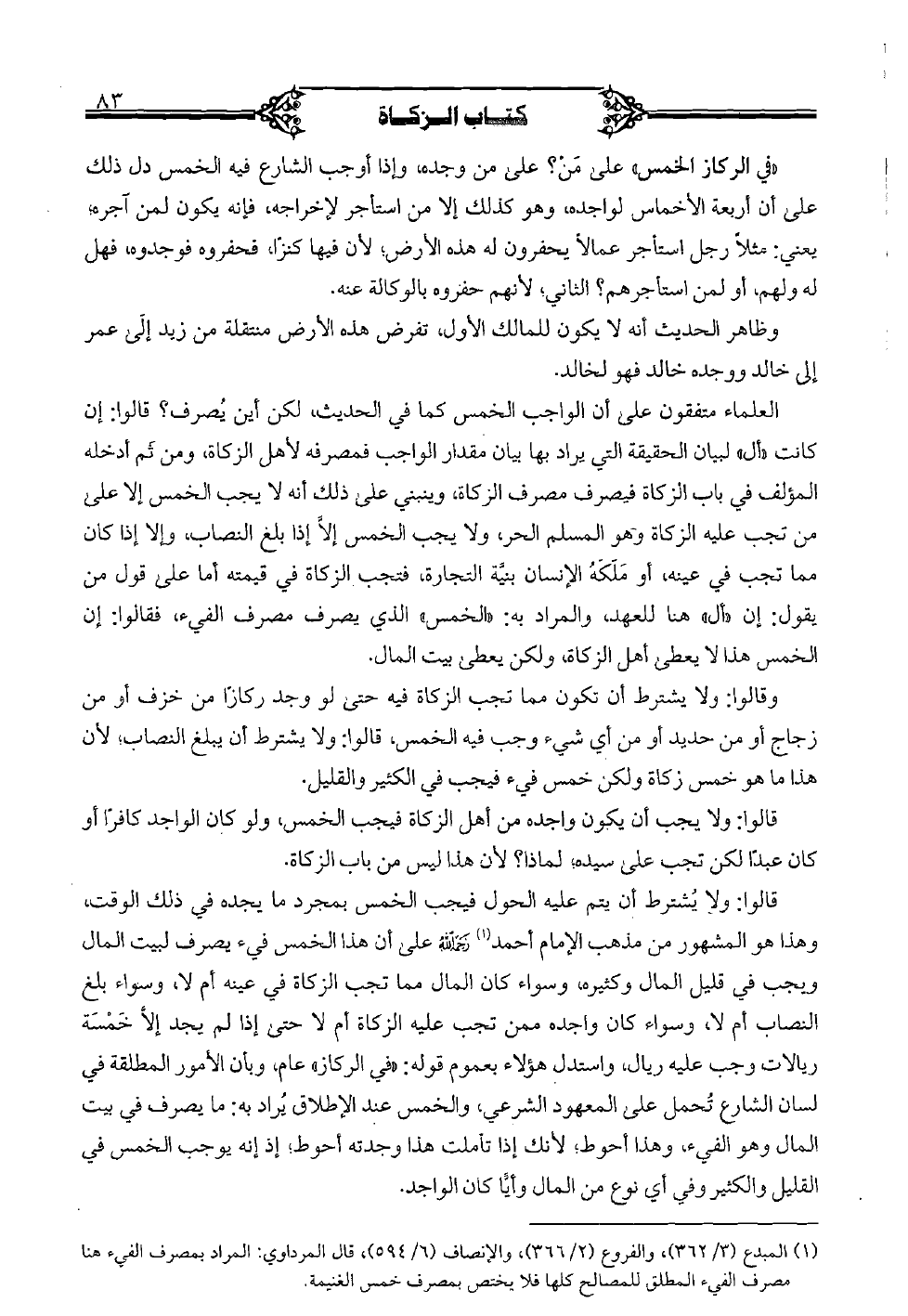 قالوا: ولا يشترط أن يتم عليه الحول فيجب الخمس بمجرد ما يجده في ذلك الوقت، وهذا هو المشهور من مذهب الإمام أحمد رحمه الله على أن هذا الخمس فيء يصرف لبيت المال ويجب في قليل المال وكثيره، وسواء كان المال مما تجب الزكاة في عينه أم لا، وسواء بلغ النصاب أم لا، وسواء كان واجده ممن تجب عليه الزكاة أم لا حتى إذا لم يجد إلا خمسة ريالات وجب عليه ريال، واستدل هؤلاء بعموم قوله: "في الركاز" عام، وبأن الأمور المطلقة في لسان الشارع تحمل على المعهود الشرعي، والخمس عند الإطلاق يراد به: ما يصرف في بيت المال وهو الفيء، وهذا أحوط، لأنك إذا تأملت هذا وجدته أحوط، إذ إنه يوجب الخمس في القليل والكثير وفي أي نوع من المال وأيا كان الواجد.