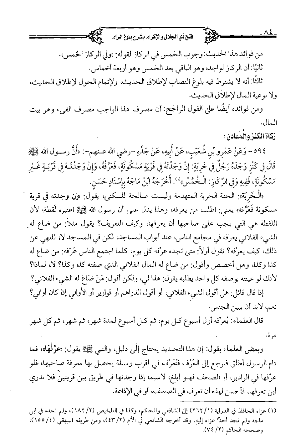 594 - وعن عمرو بن شعيبٍ، عن أبيه، عن جدِّه- رضي الله عنهم-: "أنَّ رسول الله صلى الله عليه وسلم قال في كنزٍ وجده رجل في خربةٍ: إن وجدته في قريةٍ مسكونةٍ، فعرِّفه، وإن وجدته في قريةٍ غير مسكونةٍ ففيه وفى الرِّكاة: الخمس". أخرجه ابن ماجه بإسنادٍ حسنٍ.
