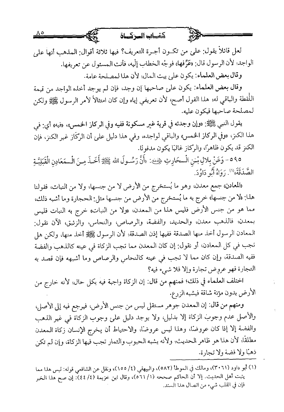 ومنهم من قال: إن المعدن جوهر مستقل ليس من جنس الأرض، فيرجع فيه إلى الأصل، والأصل عدم وجوب الزكاة إلا بدليل، ولا يوجد دليل على وجوب الزكاة في غير الذهب والفضة إلا إذا كان عروضًا، وهذا ليس عروضًا، والاحتياط أن يخرج الإنسان زكاة المعدن مطلقًا لأن هذا هو ظاهر الحديث، ولأنه يشبه الحبوب والثمار تجب فيها الزكاة، وإن لم تكن ذهبا ولا فضة ولا تجارة.