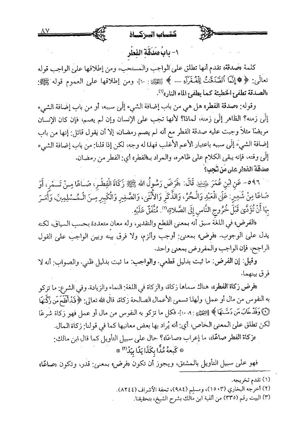 "فرض زكاة الفطر"، هناك سماها زكاة، والزكاة في اللغة: النماء والزيادة. وفي الشرع: ما تزكو به النفوس من مال أو عمل؛ ولهذا تسمى الأعمال الصالحة زكاة، قال الله تعالى: {قد أفلح من زكاها * وقد خاب من دساها} [الشمس: 9، 10]. فكل ما تزكو به النفوس من مال أو عمل فهو زكاة شرعا لكن تطلق على المعنى الخاص، أي: أنه يراد بها بعض معانيها كما في قولنا: زكاة المال.