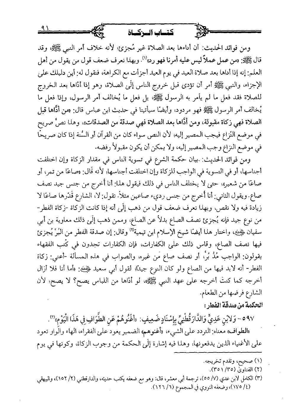 ومن فوائد الحديث: أن أداءها بعد الصلاة غير مجزئ، لأنه خلاف أمر النبي صلى الله عليه وسلم، وقد قال صلى الله عليه وسلم: "من عمل عملًا ليس عليه أمرنا فهو رد". وبهذا نعرف ضعف قول من يقول من أهل العلم: إنه إذا أداها بعد صلاة العيد في يوم العيد أجزأت مع الكراهة، فنقول له: أين دليلك على الإجزاء، والنبي صلى الله عليه وسلم أمر أن تؤدى قبل خروج الناس إلى الصلاة، وهو إذا أدّاها بعد الخروج للصلاة فقد فعل ما لم يأمر به الرسول صلى الله عليه وسلم، بل فعل ما يخالف أمر الرسول، وإذا فعل ما يخالف أمر الرسول صلى الله عليه وسلم فهو مردود، وأيضًا سيأتيننا في حديث ابن عباس قال: "من أدّاها قبل الصلاة فهي زكاة مقبولة، ومن أدّاها بعد الصلاة فهي صدقة من الصدقات" وهذا نص صريح في موضع النزاع فيجب المصير إليه؛ لأن النص سواء كان من القرآن أو السنة إذا كان صريحا في موضع النزاع وجب المصير إليه، ولا يمكن أن يكون مقبولًا رفضه.