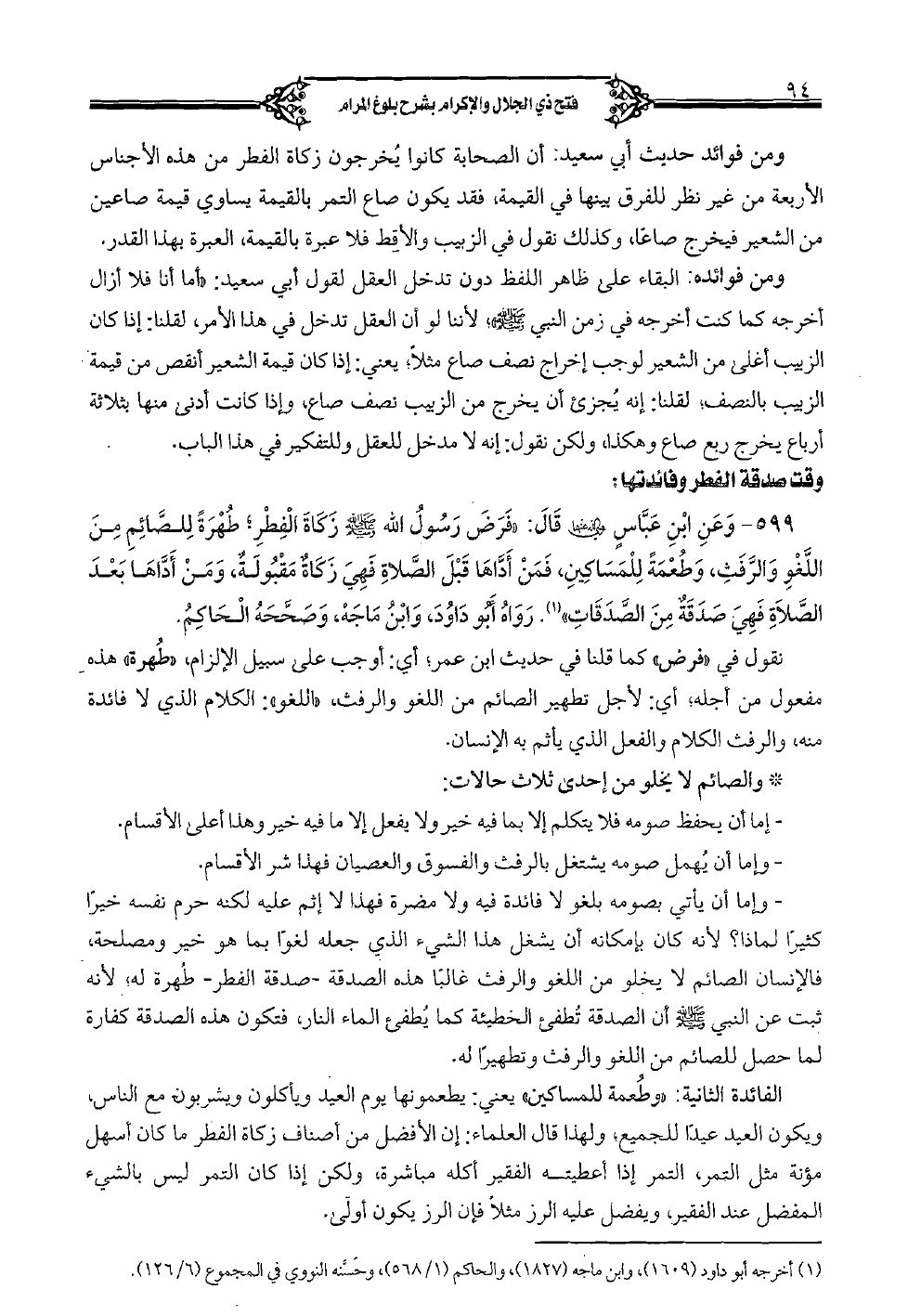 599 - وعن ابن عبَّاسٍ رضي الله عنه قال: "فرض رسول الله صلى الله عليه وسلم زكاة الفطر؛ طهرةً للصَّائم من اللَّغو والرَّفث، وطعمةً للمساكين، فمن أدَّاها قبل الصَّلاة فهي زكاةٌ مقبولةٌ، ومن أدَّاها بعد الصَّلاة فهي صدقةٌ من الصدقات". رواه أبو داود، وابن ماجه، وصححه الحاكم.