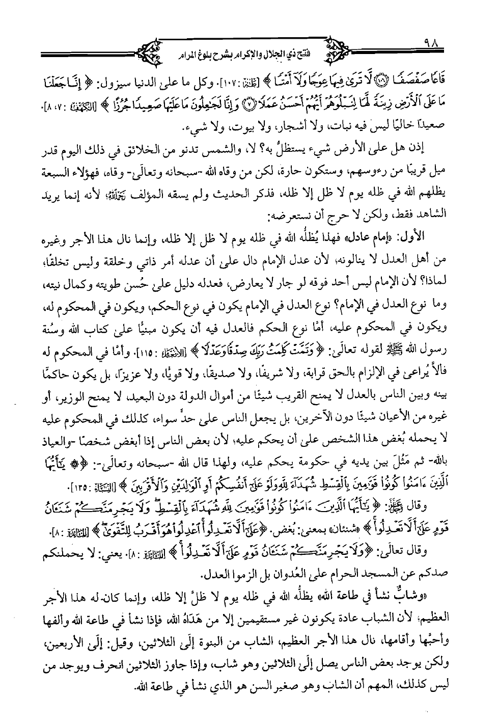 الأول: "إمام عادل" فهذا يظله الله في ظله يوم لا ظل إلا ظله، وإنما نال هذا الأجر وغيره من أهل العدل لا ينالونه؛ لأن عدل الإمام دال على أن عدله أمر ذاتي وخلقة وليس تخلقًا؛ لماذا؟ لأن الإمام ليس أحد فوقه لو جار لا يعارض، فعدله دليل على حسن طويته وكمال نيته، وما نوع العدل في الإمام؟ نوع العدل في الإمام يكون في نوع الحكم، ويكون في المحكوم له، ويكون في المحكوم عليه، أمّا نوع الحكم فالعدل فيه أن يكون مبنيًا على كتاب الله وسنة رسول الله صلى الله عليه وسلم لقوله تعالى: {وتمت كلمت ربك صدقًا وعدلًا} [الأنعام: 115]. وأمًا في المحكوم له فألا يراعى في الإلزام بالحق قرابة، ولا شريفًا، ولا صديقًا، ولا قويًا، ولا عزيزًا، بل يكون حاكمًا بينه وبين الناس بالعدل لا يمنح القريب شيئا من أموال الدولة دون البعيد، لا يمنح الوزير، أو غيره من الأعيان شيئًا دون الآخرين، بل يجعل الناس على حد سواء، كذلك في المحكوم عليه لا يحمله بغض هذا الشخص على أن يحكم عليه؛ لأن بعض الناس إذا أبغض شخصًا- والعياذ بالله- ثم مثل بين يديه في حكومة يحكم عليه، ولهذا قال الله- سبحانه وتعالى-: {* يأيها الذين أمنوا كونوا قوامين بالقسط شهداء لله ولو على أنفسكم أو الوالدين والأقربين} [النساء: 135].