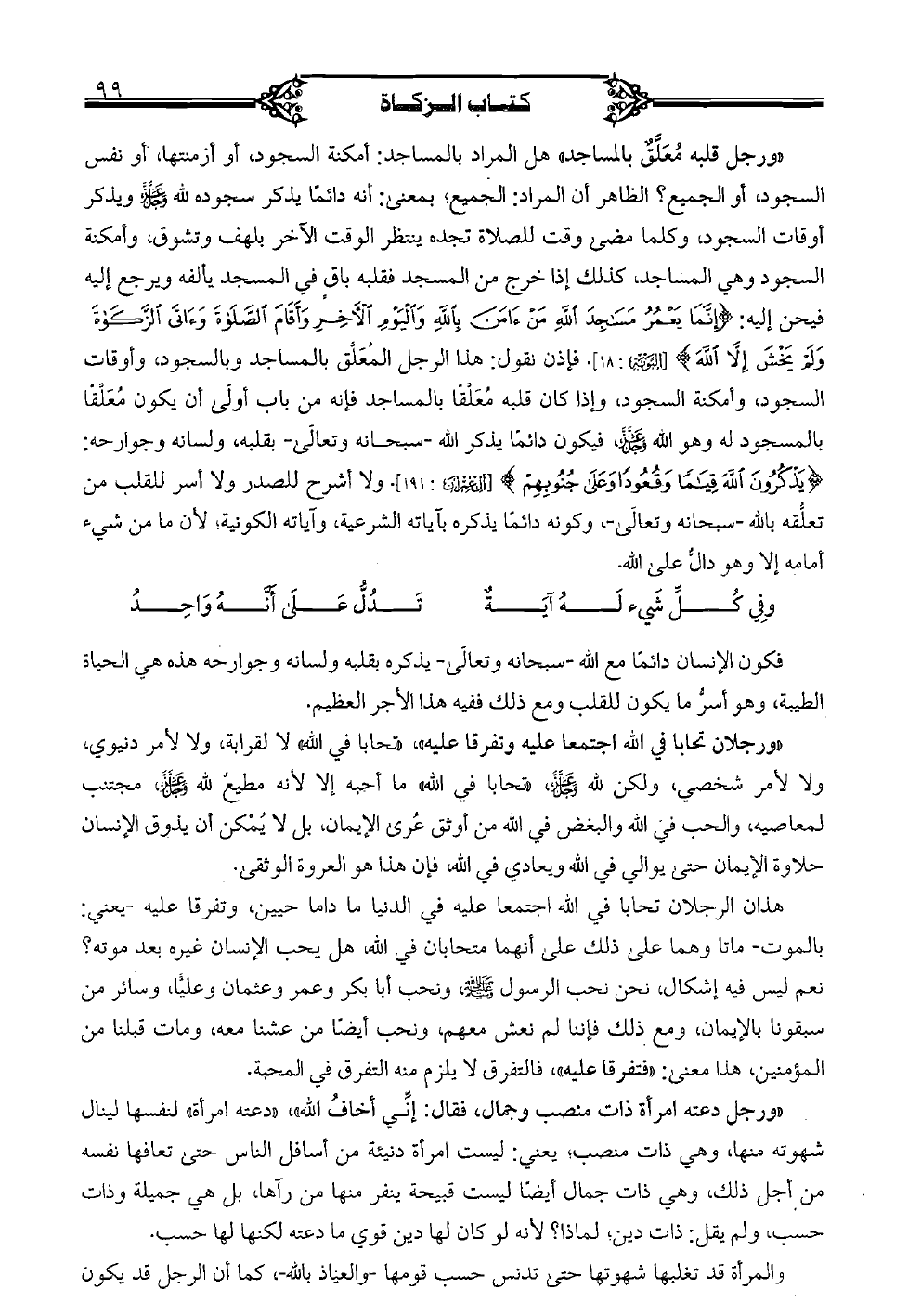 "ورجل قلبه معلق بالمساجد" هل المراد بالمساجد: أمكنة السجود، أو أزمنتها، أو نفس السجود، أو الجميع؟ الظاهر أن المراد: الجميع، بمعنى: أنه دائمًا يذكر سجوده لله عز وجل ويذكر أوقات السجود، وكلما مضى وقت للصلاة تجده ينتظر الوقت الآخر بلهف وتشوق، وأمكنة السجود وهي المساجد، كذلك إذا خرج من المسجد فقلبه باق في المسجد يألفه ويرجع إليه فيحن إليه: {إنما يعمر مساجد الله من امن بالله واليوم الآخر وأقام الصلاة واتى الزكاة ولم يخشى إلا الله} [التوبة: 18]. فإذن نقول: هذا الرجل المعلق بالمساجد وبالسجود، وأوقات السجود، وأمكنة السجود، وإذا كان قلبه معلقا بالمساجد فإنه من باب أولى أن يكون معلقًا بالمسجود له وهو الله عز وجل، فيكون دائمًا يذكر الله- سبحانه وتعالى- بقلبه، ولسانه وجوارحه: {يذكرون الله فيامًا وقعودًا وعلى جنوبهم} [آل عمران: 191]. ولا أشرح للصدر ولا أسر للقلب من تعلقه بالله- سبحانه وتعالى- وكونه دائمًا يذكره بآياته الشرعية، وآياته الكونية؛ لأن ما من شيء أمامه إلا وهو دال على الله.