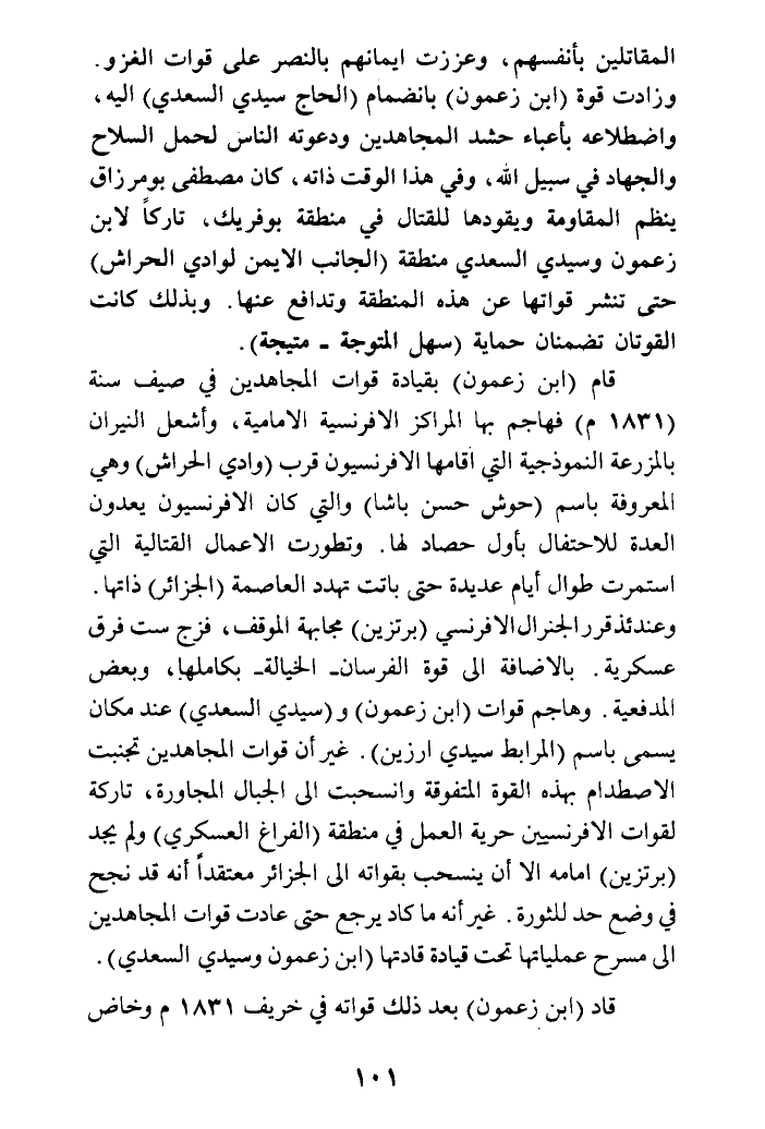 المقاتلين بأنفسهم، وعززت إيمانهم بالنصر على قوات الغزو. وزادت قوة (ابن زعمون) بانضمام (الحاج سيدي السعدي) إليه، واضطلاعه بأعباء حشد المجاهدين ودعوته الناس لحمل السلاح والجهاد فى سبيل الله، وفي هذا الوقت ذاته، كان مصطفى بومرزاق ينظم المقاومة ويقودها للقتال في منطقة بوفريك، تاركا لابن زعمون وسيدي السعدي منطقة (الجانب الأيمن لوادي الحراش) حتى تنشر قواتها عن هذه المنطقة وتدافع عنها. وبذلك كانت القوتان تضمنان حماية (سهل المتوجة - متيجة).