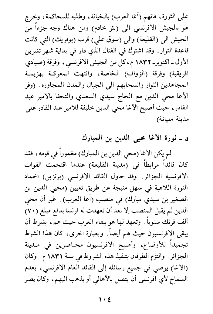 على الثورة، فاتهم (آغا العرب) بالخيانة، وطلبه للمحاكمة، وخرج هو بالجيش الإفرنسي إلى (بئر خادم) ومن هناك وجه جزءا من الجيش إلى (القليعة) وإلى (سوق علي) قرب (بوفريك) التي كانت قاعدة الثوار. وقد اشترك في القتال الذي دار في بداية شهر تشرين الأول - أكتوبر - 1832 م، كل من الجيش الإفرنسي، وفرقة (صيادي إفريقية) وفرقة (الزواف) الخاصة، وانتهت المعركة بهزيمة المجاهدين الثوار وانسحابهم إلى الجبال والمدن المجاوره. (وفر الآغا محيي الدين مع الحاج سيدي السعدي والتحقا بالأمير عبد القادر، حيث أصبح الآغا محيي الدين خليفة للأمير عبد القادر على مدينة مليانة).