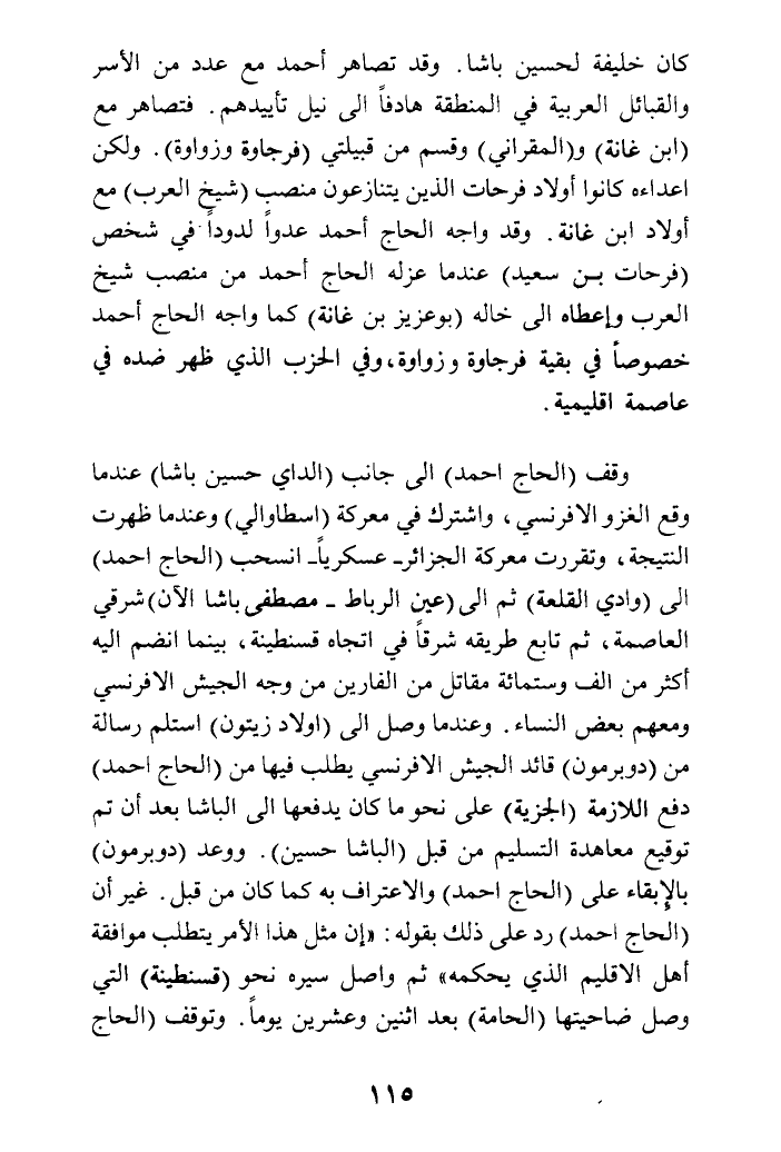 النتيجة، وتقررت معركة الجزائر - عسكريا - انسحب (الحاج أحمد) إلى (وادي القلعة) ثم إلى (عين الرباط - مصطفى باشا الآن) شرقي العاصمة، ثم تابع طريقه شرقا في اتجاه قسنطينة، بينما انضم إليه أكثر من ألف وستمائة مقاتل من الفارين من وجه الجيش الإفرنسي ومعهم بعض النساء. وعندما وصل إلى (أولاد زيتون) استلم رسالة من (دوبرمون) قائد الجيش الإفرنسي يطلب فيها من (الحاج أحمد) دفع اللازمة (الجزية) على نحو ما كان يدفعها إلى الباشا بعد أن تم توقيع معاهدة التسليم من قبل (الباشا حسين). ووعد (دوبرمون) بالإبقاء على (الحاج أحمد) والاعتراف به كما كان من قبل. غير أن (الحاج أحمد) رد على ذلك بقوله: (إن مثل هذا الأمر يتطلب موافقة أهل الإقليم الذي يحكمه) ثم واصل سيره نحو (قسنطينة) التي وصل ضاحيتها (الحامة) بعد اثنين وعشرين يوما. وتوقف (الحاج