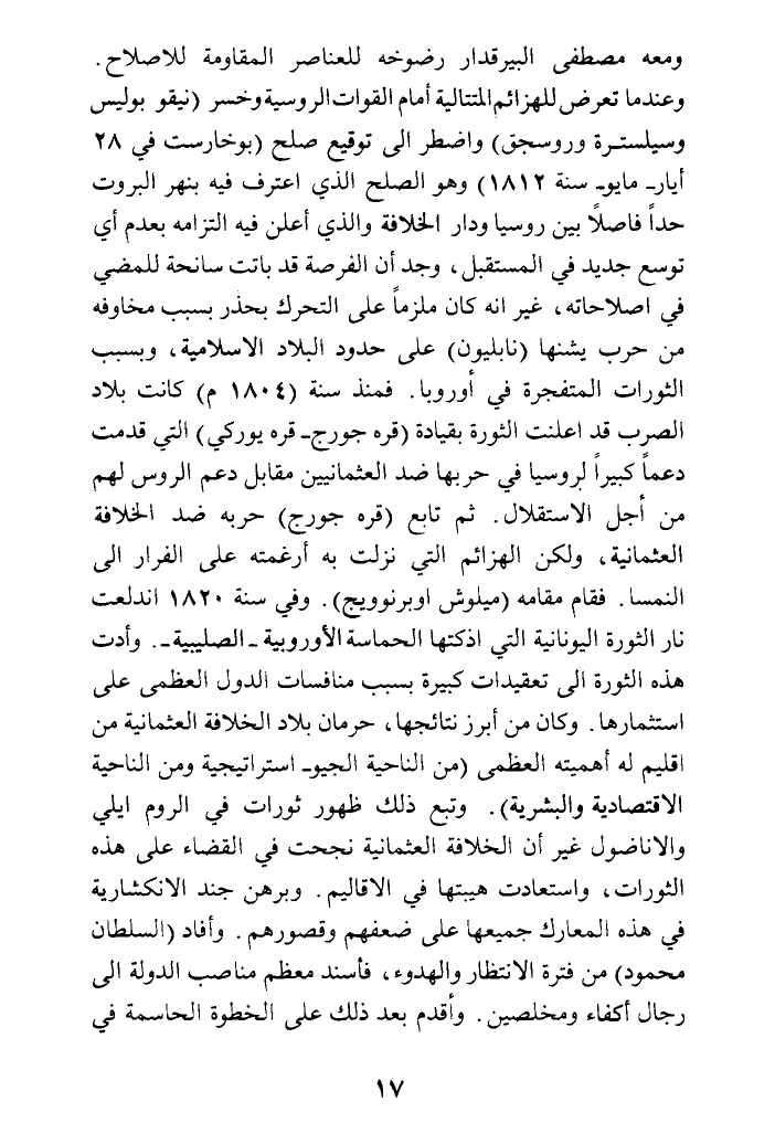 ومعه مصطفى البيرقدار رضوخه للعناصر المقاومة للإصلاح. وعندما تعرض للهزائم المتتالية أمام القوات الروسية وخسر (نيقو بوليس وسيلستره وروسجق) واضطر إلى توقيع صلح (بوخارست في 28 أيار - مايو سنة 1812) وهو الصلح الذي اعترف فيه بنهر البروت حدا فاصلا بين روسيا ودار الخلافة والذي أعلن فيه التزامه بعدم أي توسع جديد في المستقبل، وجد أن الفرصة قد باتت سانحة للمضي في إصلاحاته، غير أنه كان ملزما على التحرك بحذر بسبب مخاوفه من حرب يشنها (نابليون) على حدود البلاد الإسلامية، وبسبب الثورات المتفجرة في أوروبا. فمنذ سنة (1804 م) كانت بلاد الصرب قد أعلنت الثورة بقيادة (قره جورج - قره يوركي) التي قدمت دعما كبيرا لروسيا في حربها ضد العثمانيين مقابل دعم الروس لهم من أجل الاستقلال. ثم تابع (قره جورج) حربه ضد الخلافة العثمانية، ولكن الهزائم التي نزلت به أرغمته على الفرار إلى النمسا. فقام مقامه (ميلوش اوبرنوويج). وفي سنة 1820 اندلعت نار الثورة اليونانية التي أذكتها الحماسة الأوروبية - الصليبية -. وأدت هذه الثورة إلى تعقيدات كبيرة بسبب منافسات الدول العظمى على استثمارها. وكان من أبرز نتائجها، حرمان بلاد الخلافة العثمانية من إقليم له أهميته العظمى (من الناحية الجيو - استراتيجية ومن الناحية الاقتصادية والبشرية). وتبع ذلك ظهور ثورات في الروم إيلي والأناضول غير أن الخلافة العثمانية نجحت في القضاء على هذه الثورات، واستعادت هيبتها في الإقاليم. وبرهن جند الإنكشارية في هذه المعارك جميعها على ضعفهم وقصورهم. وأفاد (السلطان محمود) من فترة الانتظار والهدوء، فأسند معظم مناصب الدولة إلى رجال أكفاء ومخلصين. وأقدم بعد ذلك على الخطوة الحاسمة في