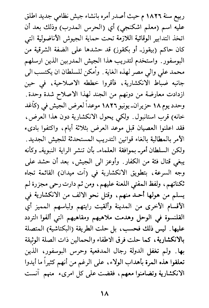 ربيع سنة 1826م حيث أصدر أمره بإنشاء جيش نظامي جديد أطلق عليه اسم (معلم اشكنجي) أي (الحرس المدرب) وذلك بعد أن اتخذ التدابير الوقائية اللازمة تحت حماية الجيوش الأناضولية التي كان حاكم (بيقوز - أو بكقوز) قد حشدها على الضفة الشرقية من البوسفور. واستخدم لتدريب هذا الجيش المدربين الذين أرسلهم محمد علي والي مصر لهذه الغاية. وأمكن للسلطان أن يكتسب إلى جانبه ضباط الإنكشارية، فأقروا خططه الإصلاحية، في حين ازدادت معارضة من دونهم من الجند لهذا الإصلاح شدة وحدة. وحدد يوم 18 حزيران - يونيو 1826 موعدا لعرض الجيش في (كآغد خانه) قرب استانبول. ولكي يحول الإنكشارية دون هذا العرض، فقد أعلنوا العصيان قبل موعد العرض بثلاثة أيام، واكتفوا بادىء الأمر بالمطالبة بإلغاء قوانين التدريب المستحدثة للجيش الجديد. ولكن السلطان أمر - بموافقة العلماء - بأن تنشر الراية النبوية - وكأنه يبغي قتال فئة من الكفار. وأوعز إلى الجيش، بعد أن حشد على وجه السرعة، بتطويق الإنكشارية في (آت ميدان) القائمه تجاه ثكناتهم، ولفظ المفتي اللعنة عليهم، ومن ثم دارت رحى مجزرة لم يسلم من هولها أحد منهم، وقتل نحو الألف من الإنكشارية في الأقسام الأخرى من المدينة وألقيت رايتهم ولباسهم المميز أي القلنسوة في الوحل وهدمت ملاهيهم ومقاهيهم التي ألفوا التردد عليها. ليس ذلك فحسب، بل حلت الطريقة (البكتاشية) المتصلة بالإنكشارية، كما حلت فرق الإطفاء والحمالين ذات الصلة الوثيقة بها. ولم تغفل الدولة رجال المدفعية وحرس البوسفور، الذين تعلقوا هذه المرة بأهداب الولاء، على الرغم من أنهم كثيرا ما أيدوا الإنكشارية وتضامنوا معهم، فقضت على كل امرىء منهم آنست