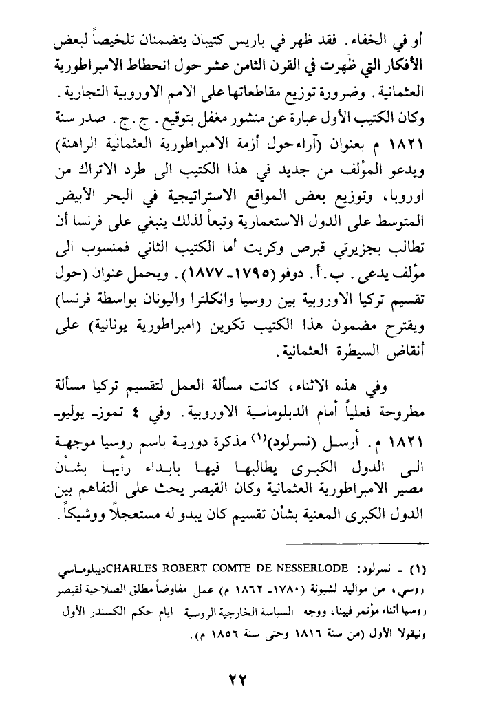 (¬1) - نسرلود: CHARLES ROBERT COMTE DE NESSERLODE ديبلوماسي روسي، من مواليد لشبونة (1780 - 1862 م) عمل مفاوضا مطلق الصلاحية لقيصر روسيا أثناء موتمر فيينا، ووجه السياسة الخارجية الروسية أيام حكم ألكسندر الأول ونيقولا الأول (من سنة 1816 وحتى سنة 1856 م).