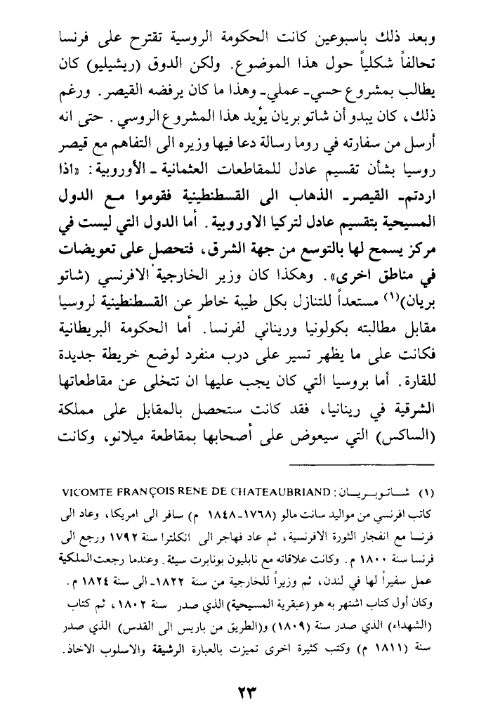 (¬1) شاتوبريان: VICOMTE FRANCOIS RENE DE CHATEAUBRIAND كاتب إفرنسي من مواليد سانت مالو (1768 - 1848 م) سافر إلى أمريكا، وعاد إلى فرنسا مع انفجار الثورة الإفرنسية، ثم عاد فهاجر إلى إنكلترا سنة 1792 ورجع إلى فرنسا سنة 1800م. وكانت علاقاته مع نابليون بونابرت سيئة. وعندما رجعت الملكية عمل سفيرا لها في لندن، ثم وزيرا للخارجية من سنة 1822 - إلى سنة 1824م. وكان أول كتاب اشتهر به هو (عبقرية المسيحية) الذي صدر سنة 1802، ثم كتاب (الشهداء) الذي صدر سنة (1809) و (الطريق من باريس إلى القدس) الذي صدر سنة (1811 م) وكتب كثيرة أخرى تميزت بالعبارة الرشيقة والأسلوب الأخاذ.