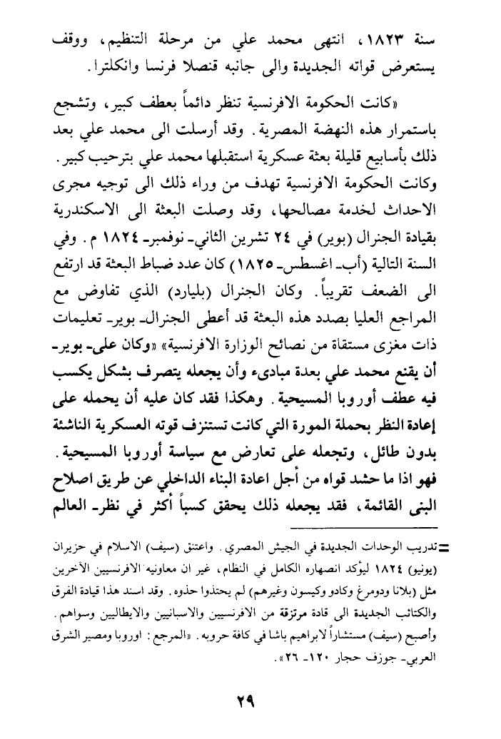 (كانث الحكومة الإفرنسية تنظر دائما بعطف كبير، وتشجع باستمرار هذه النهضة المصرية. وقد أرسلت إلى محمد علي بعد ذلك بأسابيع قليلة بعثة عسكرية استقبلها محمد علي بترحيب كبير. وكانت الحكومة الإفرنسية تهدف من وراء ذلك إلى توجيه مجرى الأحداث لخدمة مصالحها، وقد وصلت البعثة إلى الإسكندرية بقيادة الجنرال (بوير) في 24 تشرين الثاني - نوفمبر - 1824 م. وفي السنة التالية (أب - أغسطس - 1825) كان عدد ضباط البعثة قد ارتفع إلى الضعف تقريبا. وكان الجنرال (بليارد) الذي تفاوض مع المراجع العليا بصدد هذه البعثة قد أعطى الجنرال - بوير - تعليمات ذات مغزى مستقاة من نصائح الوزارة الإفرنسية) (وكان على - بوير -أن يقنع محمد علي بعدة مبادىء وأن يجعله يتصرف بشكل يكسب فيه عطف أوروبا المسيحية. وهكذا فقد كان عليه أن يحمله على إعادة النظر بحملة المورة التي كانت تستنزف قوته العسكرية الناشئة بدون طائل، وتجعله على تعارض مع سياسة أوروبا المسيحية. فهو إذا ما حشد قواه من أجل إعادة البناء الداخلي عن طريق إصلاح البنى القائمة، فقد يجعله ذلك يحقق كسبا أكثر في نظر - العالم