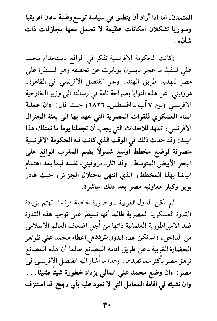 (كانت الحكومة الإفرنسية تفكر في الواقع باستخدام محمد علي لتنفيذ ما عجز نابليون بونابرت عن تحقيقه وهو السيطرة على مصر لتهديد طريق الهند. وعبر القنصل الإفرنسي في القاهرة - دروفيني - عن هذه النوايا بصراحة تامة في رسالته إلى وزير الخارجية الإفرنسي (يوم 7 آب - أغسطس - 1826) حيث قال: (إن عملية البناء العسكري للقوات المصرية التي عهد بها إلى بعثة الجنرال الإفرنسي، تمهد للأحداث التي يجب أن تجعلنا يوما ما نمتلك هذا البلد) وقد حدث ذلك في الوقت الذي كانت فيه الحكومة الإفرنسية منصرفة لوضع مخطط أوسع شمولا يضم المغرب الواقع على البحر الأبيض المتوسط. وقد أثار - دروفيني - نفسه فيما بعد اهتمام الباشا بهذا المخطط، الذي انتهى باحتلال الجزائر، حيث غادر بوير وكبار معاونيه مصر بعد ذلك مباشرة.