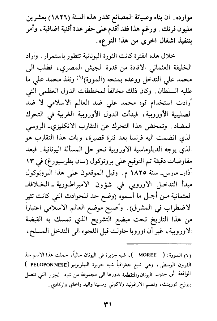 (¬1) المورة: (MOREE)، شبه جزيرة في اليونان حاليا، حملت هذا الاسم منذ القرون الوسطى، وهي تتبع جغرافيا شبه جزيرة البيلوبونيز (PELOPONNESE) الواقعة إلى جنوب اليونان والمتقطعة بدورها إلى مجموعة من شبه الجزر التي تتصل ببرزخ كورينث، وتضم الأرغوليد ولاكوني ومسينا واليد واخاي واركادي.